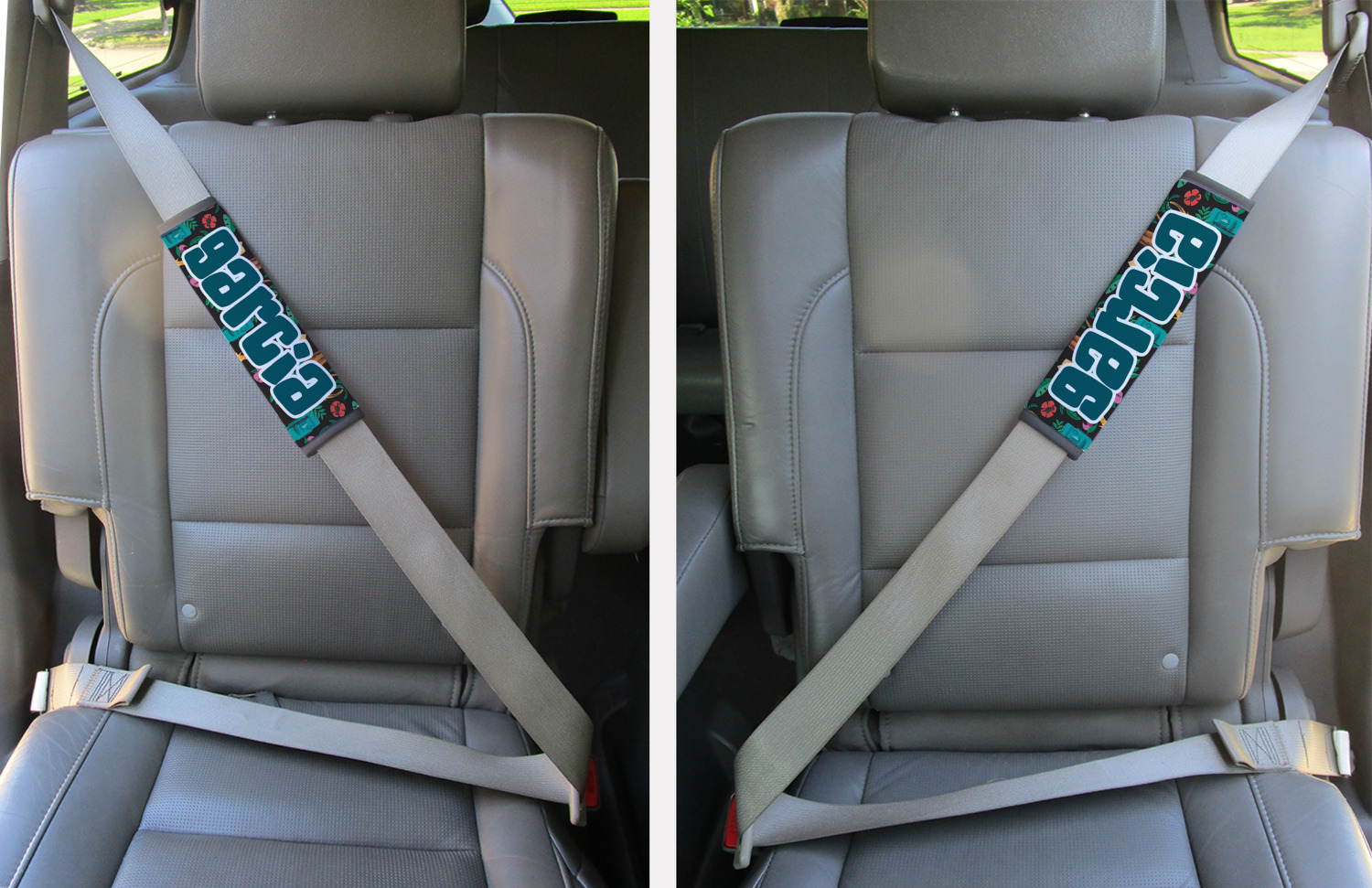 Made from neoprene, our seat belt strap covers wrap around the belt itself and have a Velcro tab for easy attachment and closure. The belt's edges are trimmed with a black polyester for a secure finish. Each cover is 9.5 by 7 inches when open and 9.5 by 2.5 inches when closed. We print your personalized design on the face of the seat belt pad.