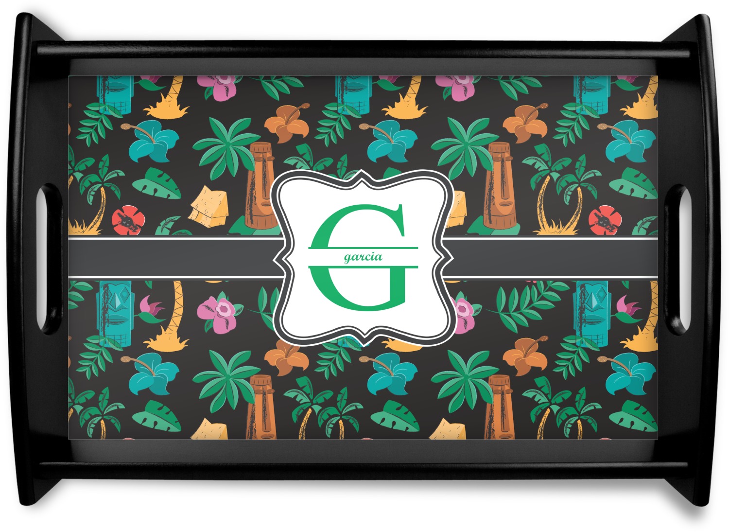 This serving tray with handles features square edges and two rounded sides, creating a very modern look. Each side is fabricated from a beautifully cut, natural wood. The bottom of the interior of the tray displays your customized design in bright, vibrant color. The tray is sold in both a black color and a natural wood look. Each variation of the wood serving tray has two sizes: Small, which is 14" x 10" x 2.25", and Large, which is 19.5" x 13.5" x 2.75".