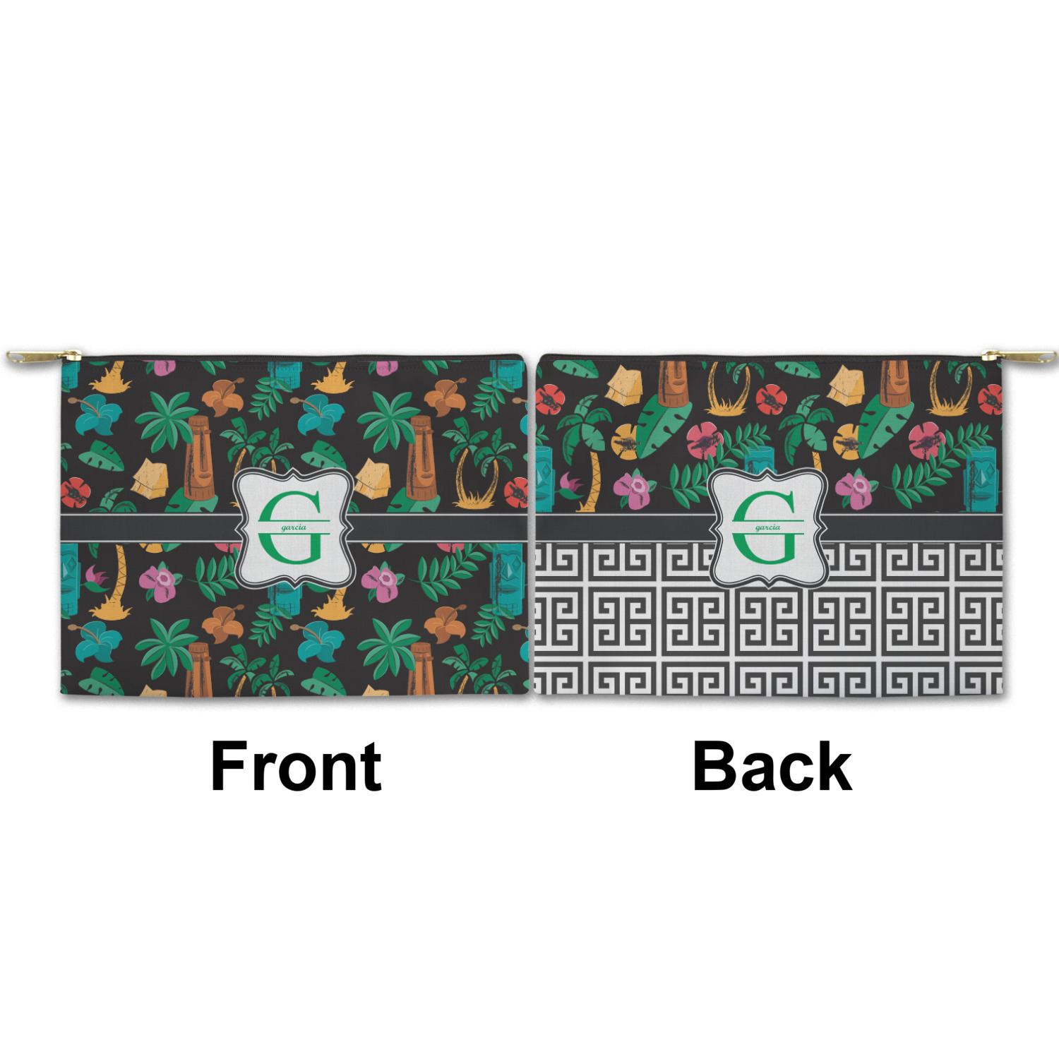 You can design both the front and the back of the pouch - same design, two complementary designs or two totally different designs - the choice is yours! We offer many different personalization styles i.e. name, name & initial, monograms - so the choice to personalize is also yours.
