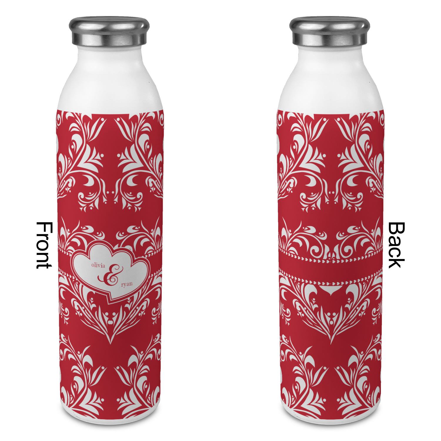 Two toned red damask hearts fill the solid red background with nothing but love. Tiny hearts link together to form a ribbon than anchor the two linking heart label. Personalize with two names to complete this love inspired damask design.