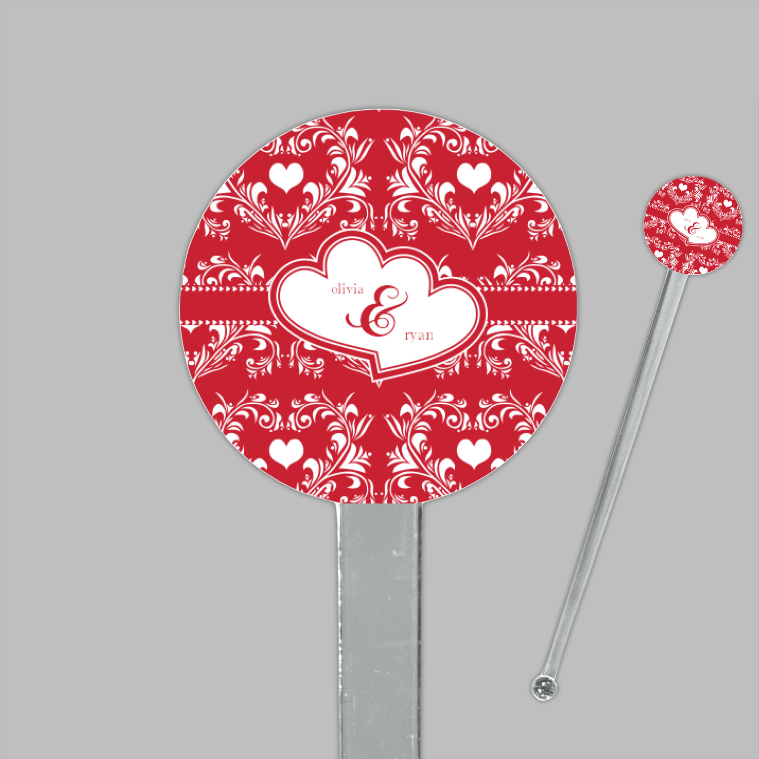 Two toned red damask hearts fill the solid red background with nothing but love. Tiny hearts link together to form a ribbon than anchor the two linking heart label. Personalize with two names to complete this love inspired damask design.