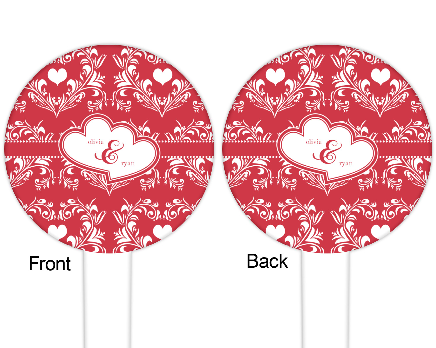 Two toned red damask hearts fill the solid red background with nothing but love. Tiny hearts link together to form a ribbon than anchor the two linking heart label. Personalize with two names to complete this love inspired damask design.