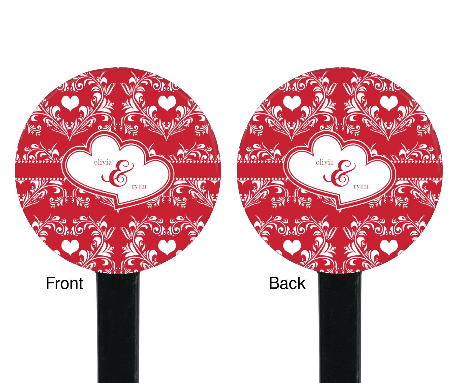 Two toned red damask hearts fill the solid red background with nothing but love. Tiny hearts link together to form a ribbon than anchor the two linking heart label. Personalize with two names to complete this love inspired damask design.