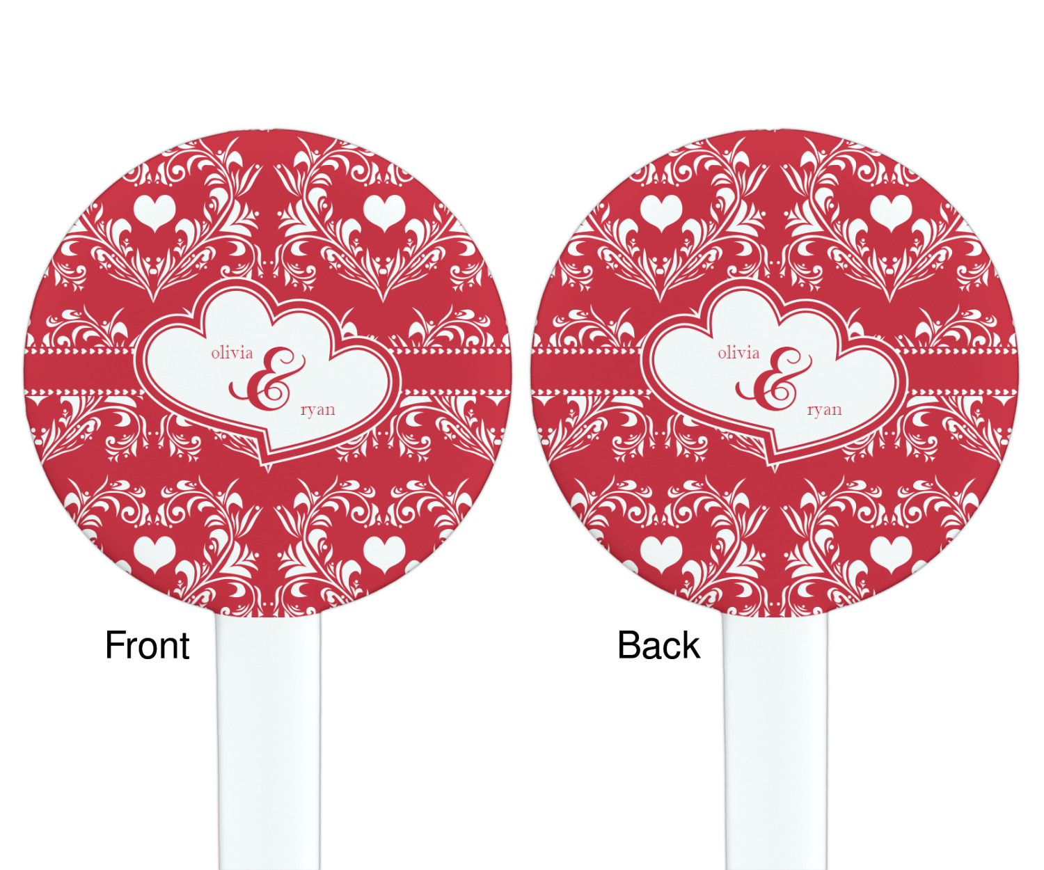 Two toned red damask hearts fill the solid red background with nothing but love. Tiny hearts link together to form a ribbon than anchor the two linking heart label. Personalize with two names to complete this love inspired damask design.