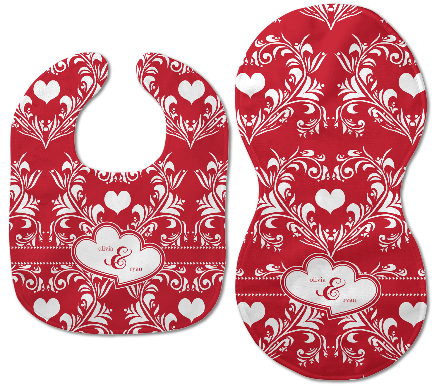 Two toned red damask hearts fill the solid red background with nothing but love. Tiny hearts link together to form a ribbon than anchor the two linking heart label. Personalize with two names to complete this love inspired damask design.
