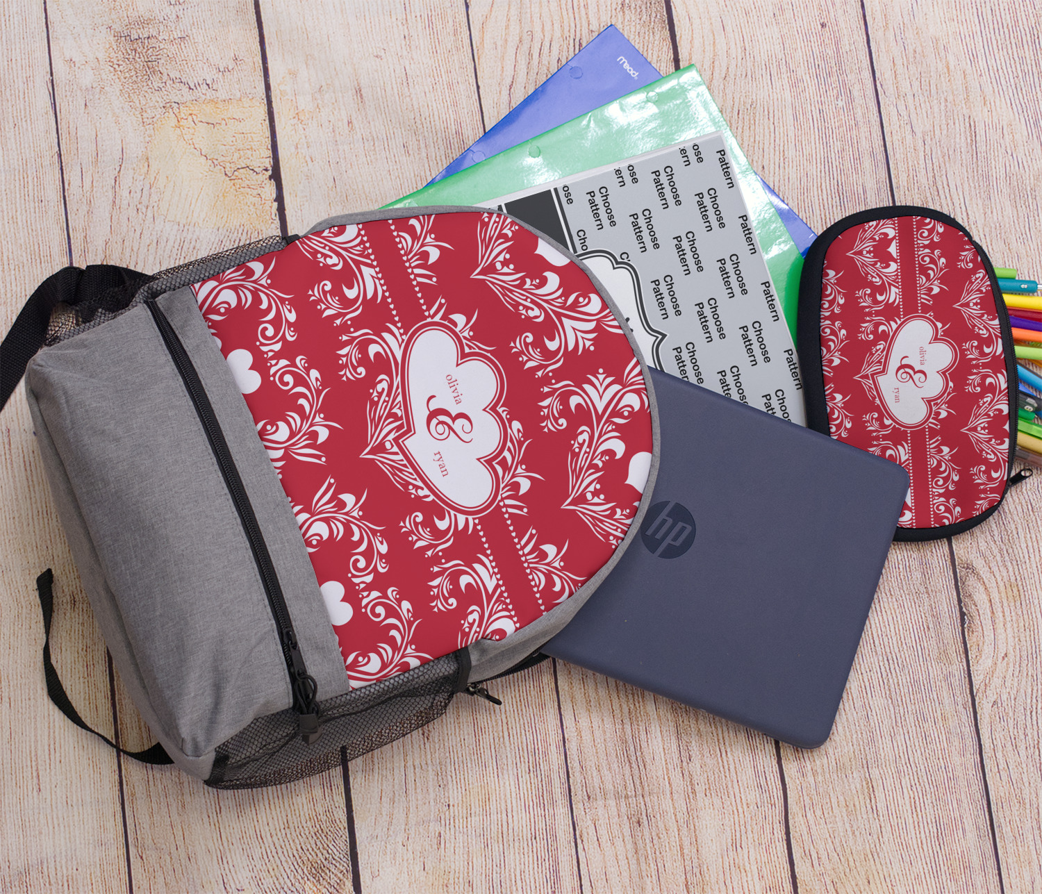 Two toned red damask hearts fill the solid red background with nothing but love. Tiny hearts link together to form a ribbon than anchor the two linking heart label. Personalize with two names to complete this love inspired damask design.