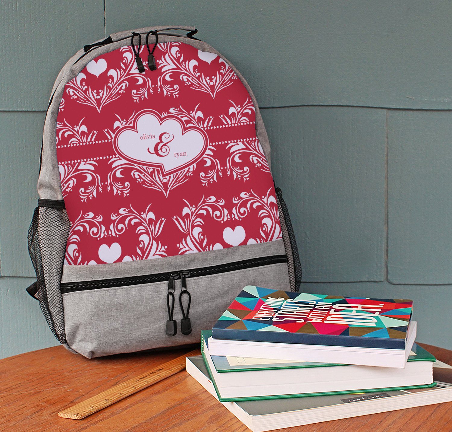 Two toned red damask hearts fill the solid red background with nothing but love. Tiny hearts link together to form a ribbon than anchor the two linking heart label. Personalize with two names to complete this love inspired damask design.