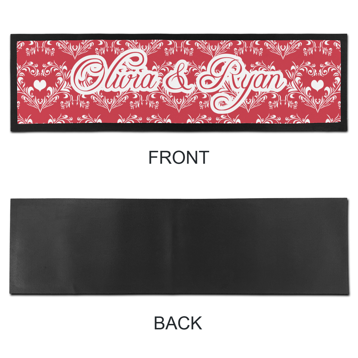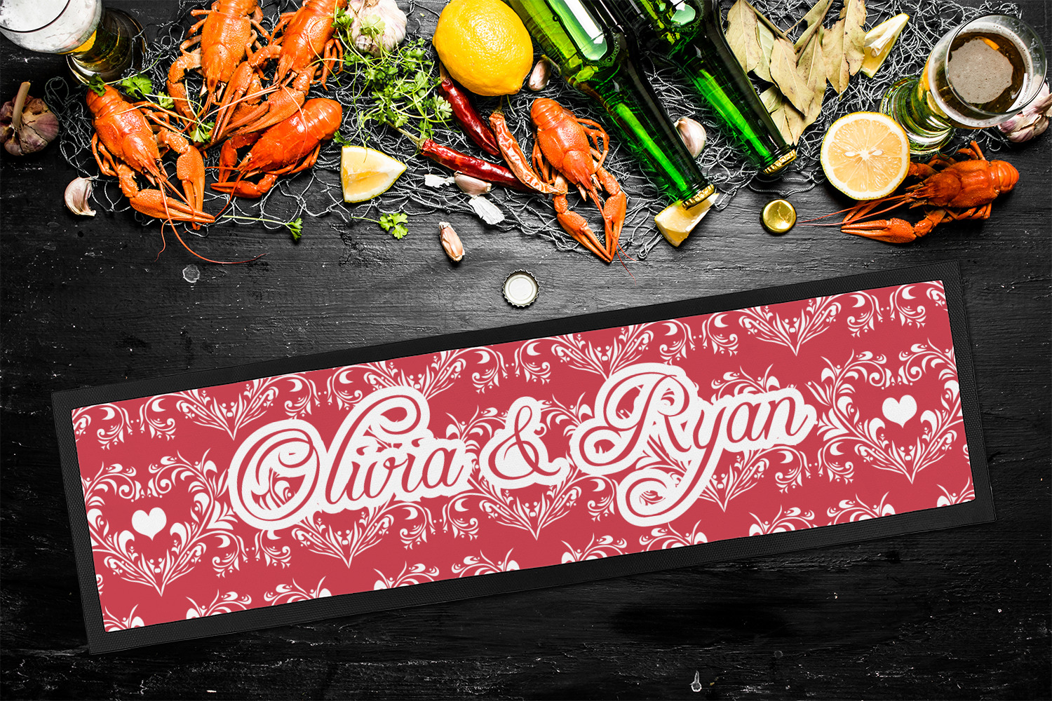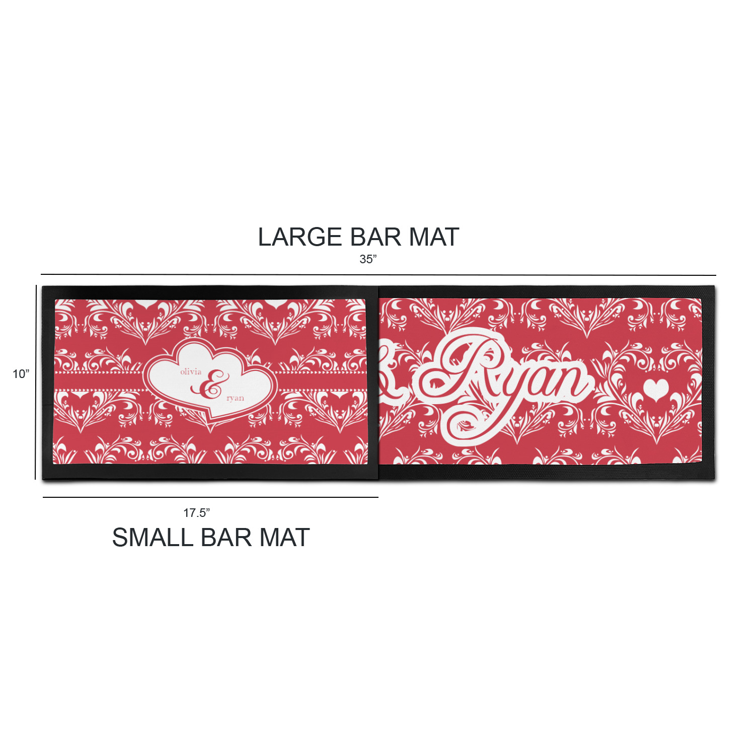 Two toned red damask hearts fill the solid red background with nothing but love. Tiny hearts link together to form a ribbon than anchor the two linking heart label. Personalize with two names to complete this love inspired damask design.
