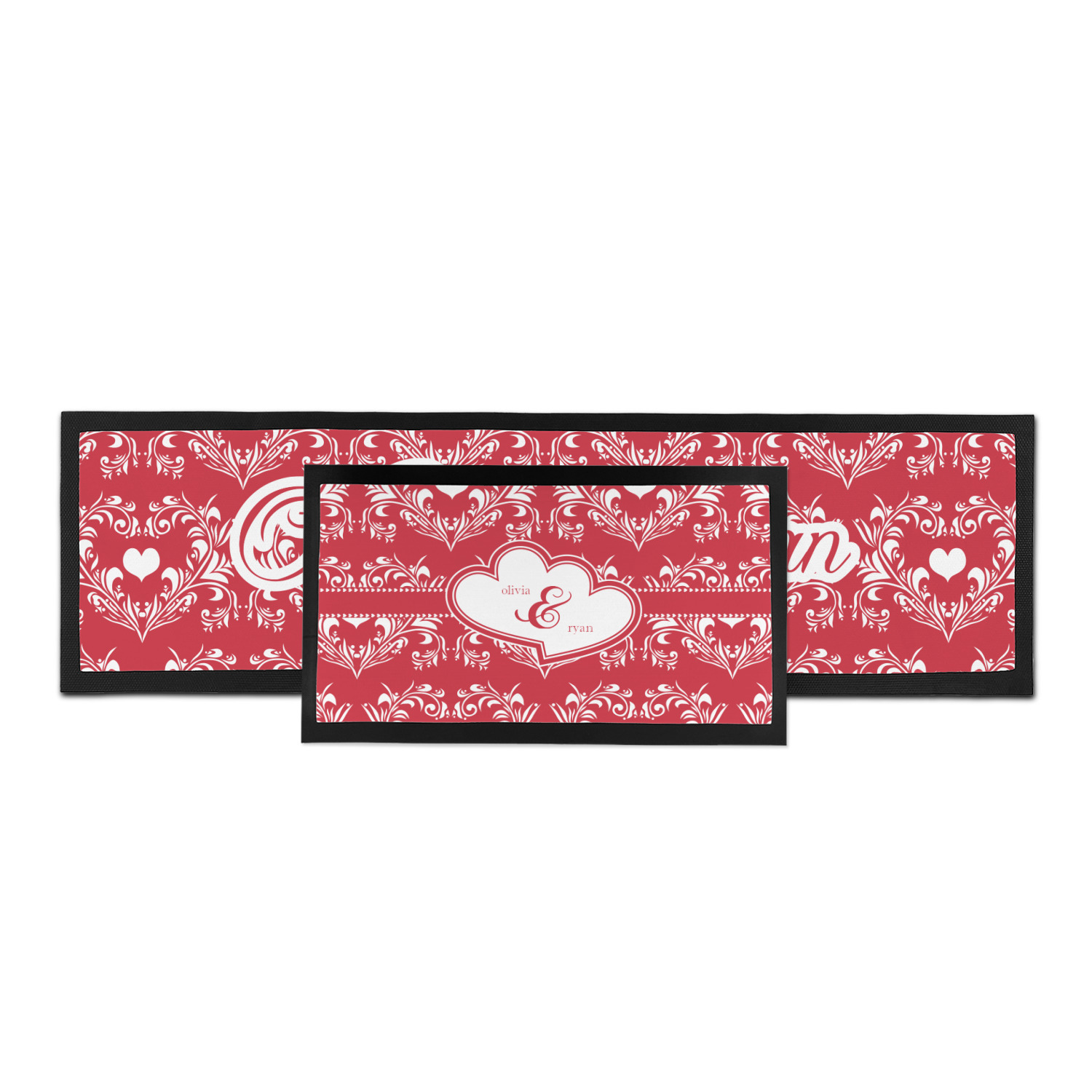 Two toned red damask hearts fill the solid red background with nothing but love. Tiny hearts link together to form a ribbon than anchor the two linking heart label. Personalize with two names to complete this love inspired damask design.