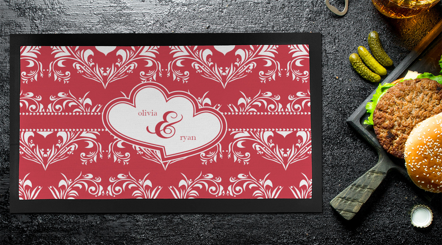 Two toned red damask hearts fill the solid red background with nothing but love. Tiny hearts link together to form a ribbon than anchor the two linking heart label. Personalize with two names to complete this love inspired damask design.