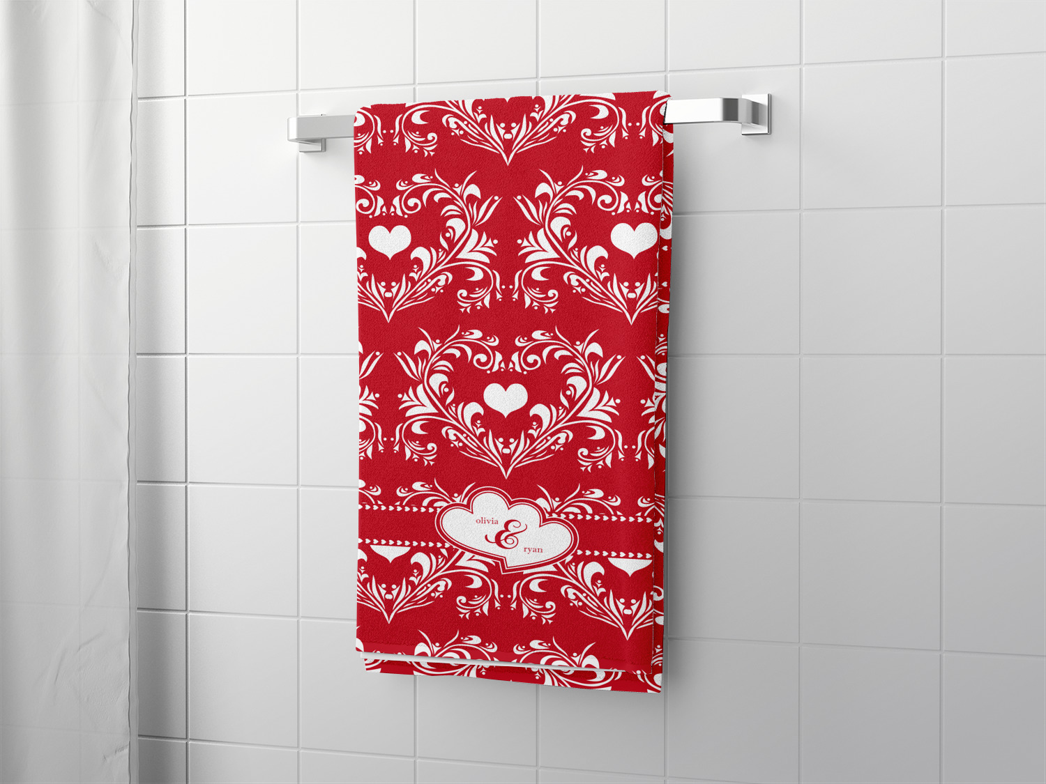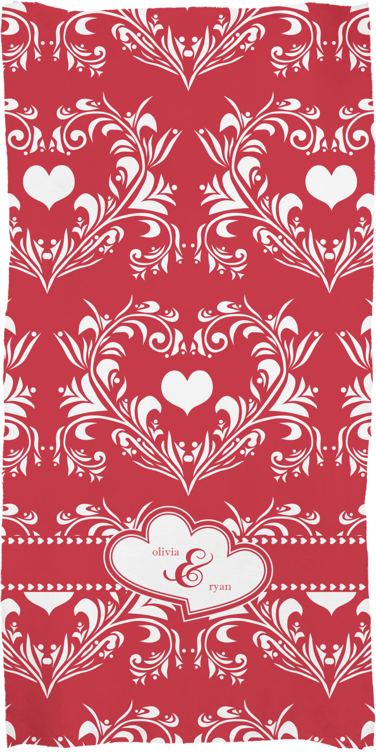 Two toned red damask hearts fill the solid red background with nothing but love. Tiny hearts link together to form a ribbon than anchor the two linking heart label. Personalize with two names to complete this love inspired damask design.