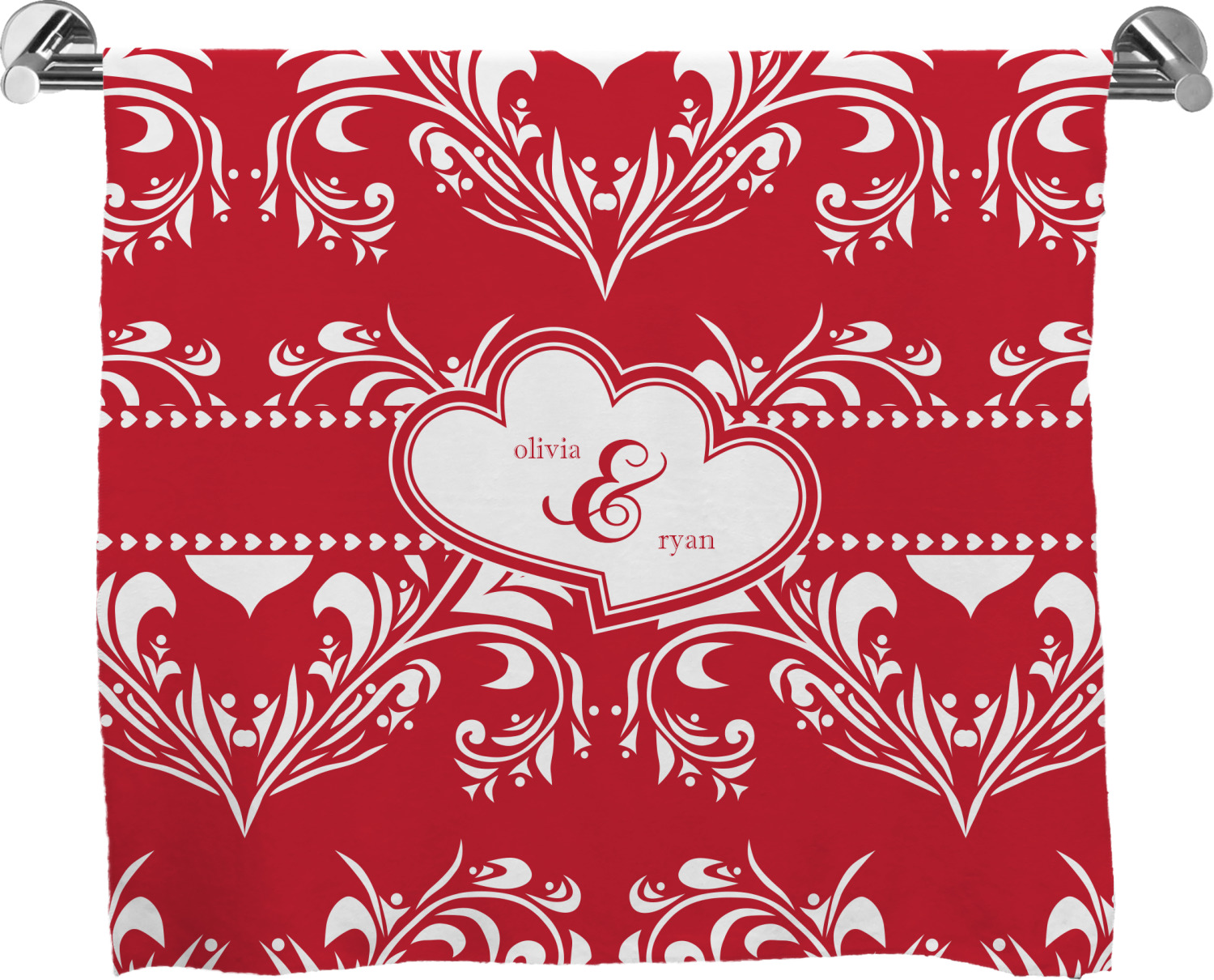 These customized bath towels are slightly larger than your standard towel and are the ideal size for wrapping around your body. They measure approximately 60" x 30". Your customization is displayed across the entire front face of the towel, while the back is white.