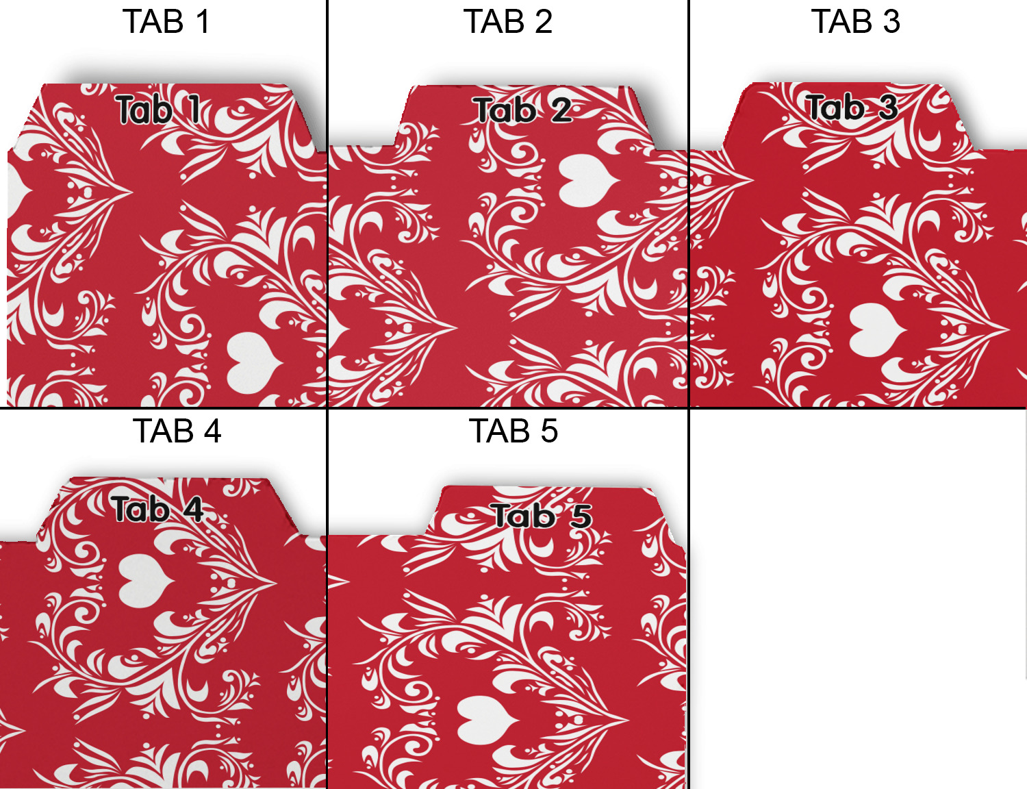 Whether you use binders at school or at work, we have designs to suit all of them. Available in 5 or 6 tab sets, you are sure to find a set to suit your needs. The back of each one is white and can be used to take notes, write vital information on, etc.