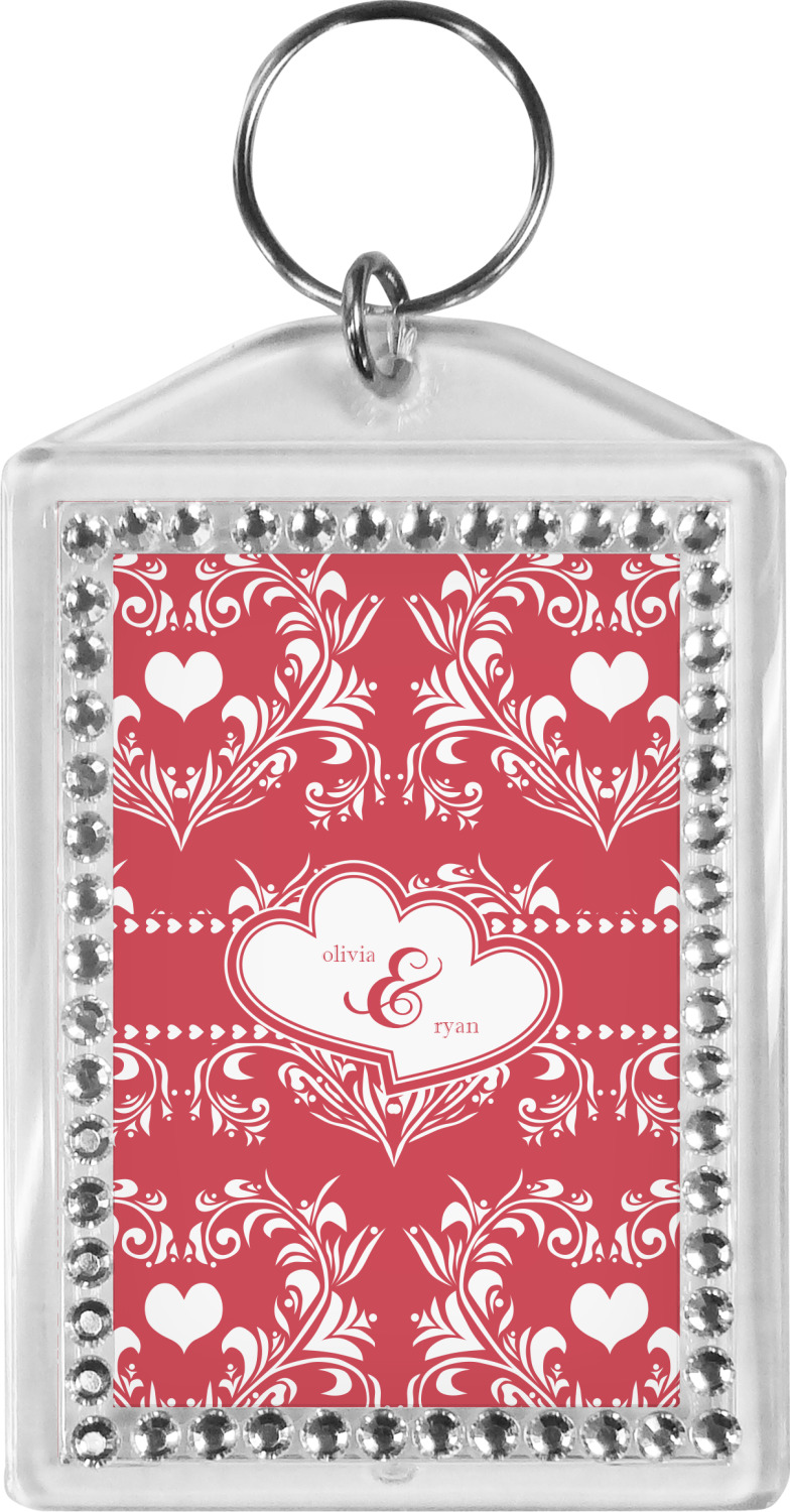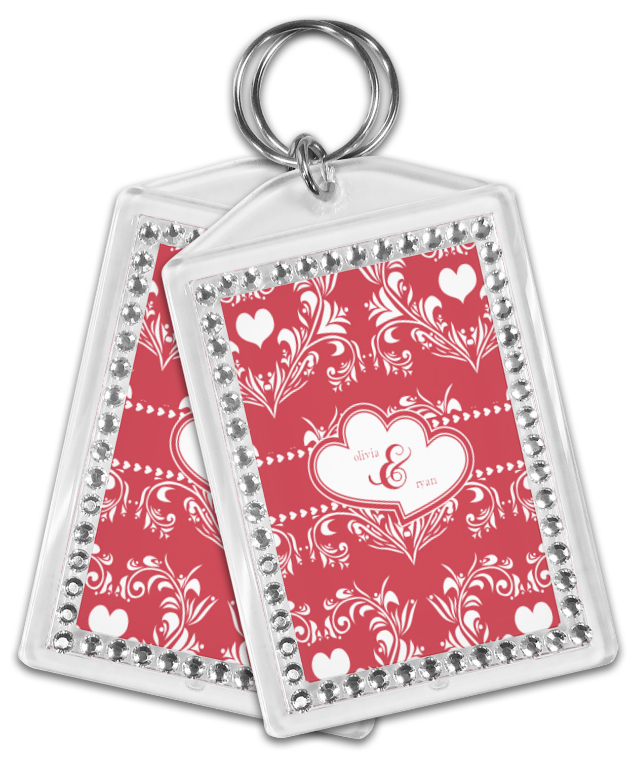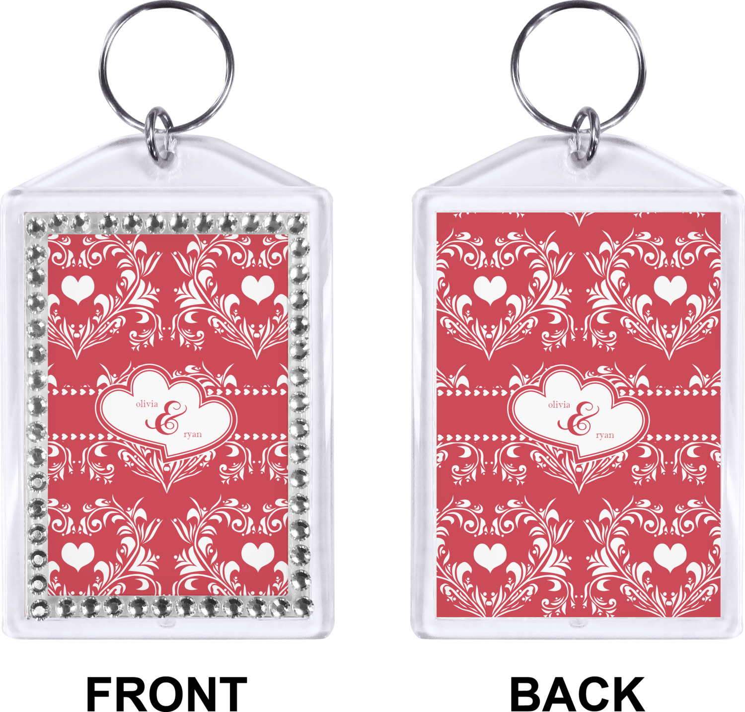 Our personalized keychains have a bold, rectangular shape, outlined by a series of shimmering rhinestones. A metal, split keyring is included with your purchase, and an additional metal hoop allows for attachment of the keychain to the split ring. This unique keychain measures at about 3.75 by 2.5 inches. We print your customized design(s) across both the back and front of this keychain.