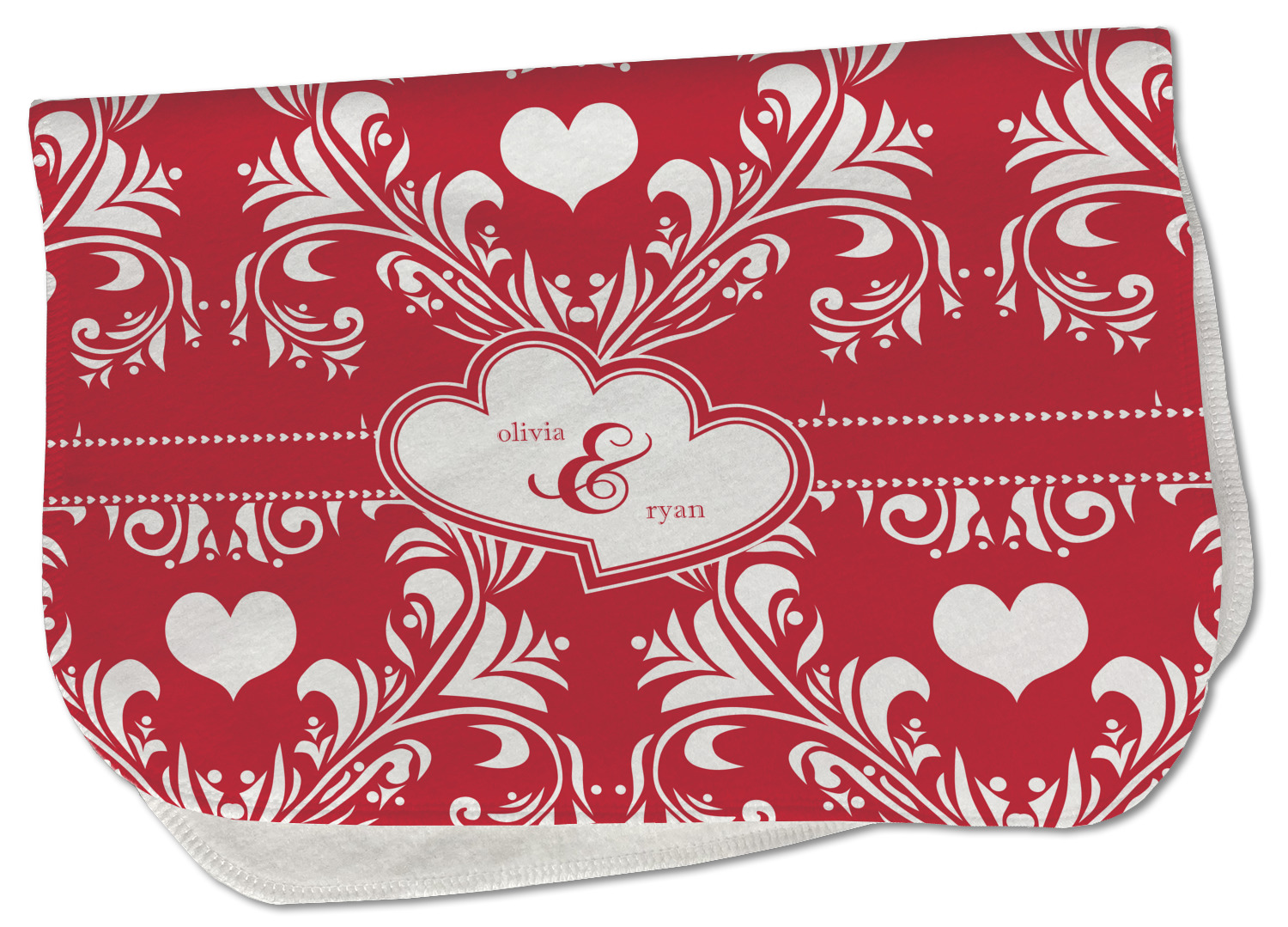 Two toned red damask hearts fill the solid red background with nothing but love. Tiny hearts link together to form a ribbon than anchor the two linking heart label. Personalize with two names to complete this love inspired damask design.