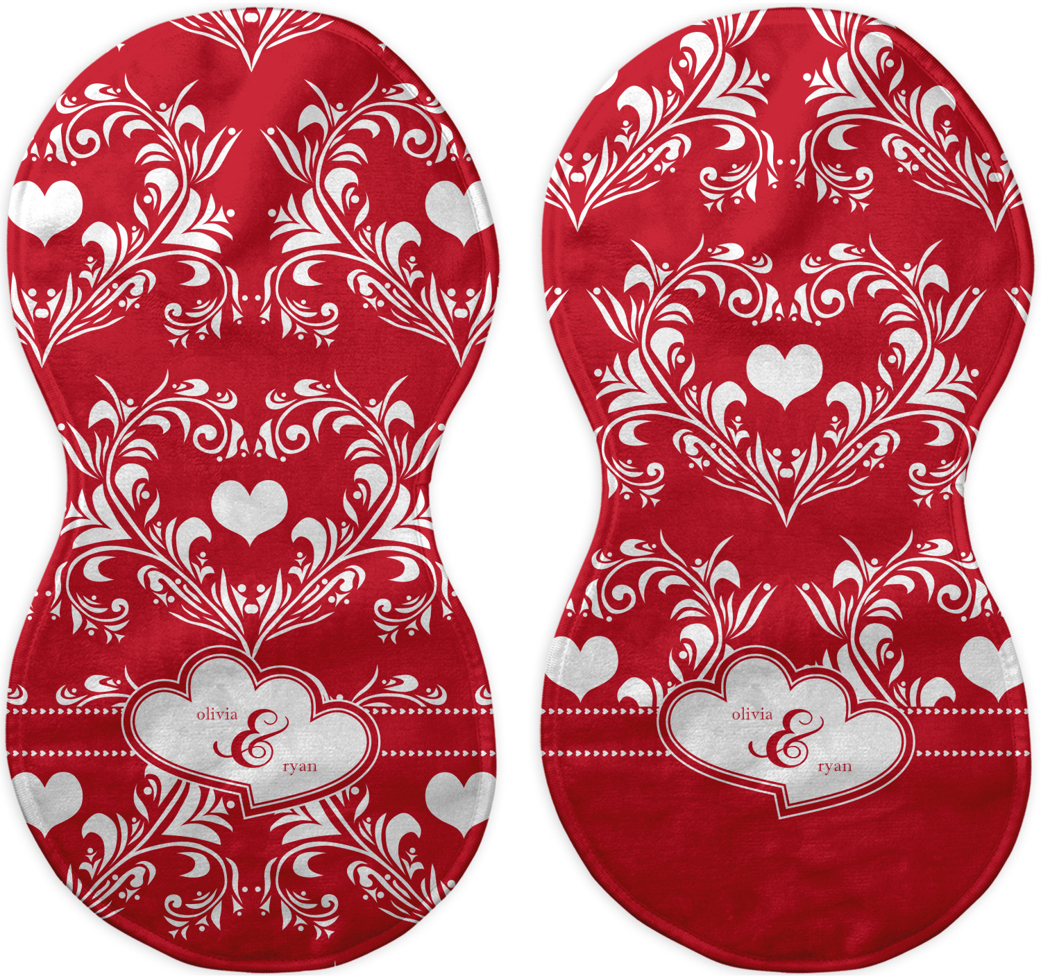 Two toned red damask hearts fill the solid red background with nothing but love. Tiny hearts link together to form a ribbon than anchor the two linking heart label. Personalize with two names to complete this love inspired damask design.