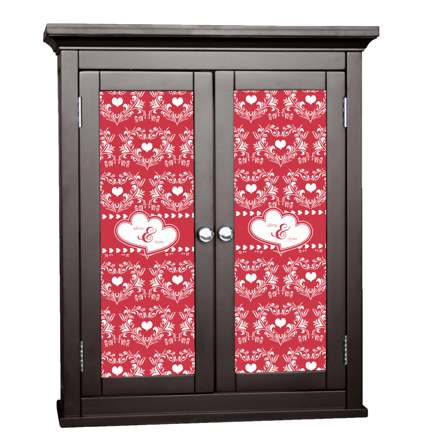 Two toned red damask hearts fill the solid red background with nothing but love. Tiny hearts link together to form a ribbon than anchor the two linking heart label. Personalize with two names to complete this love inspired damask design.