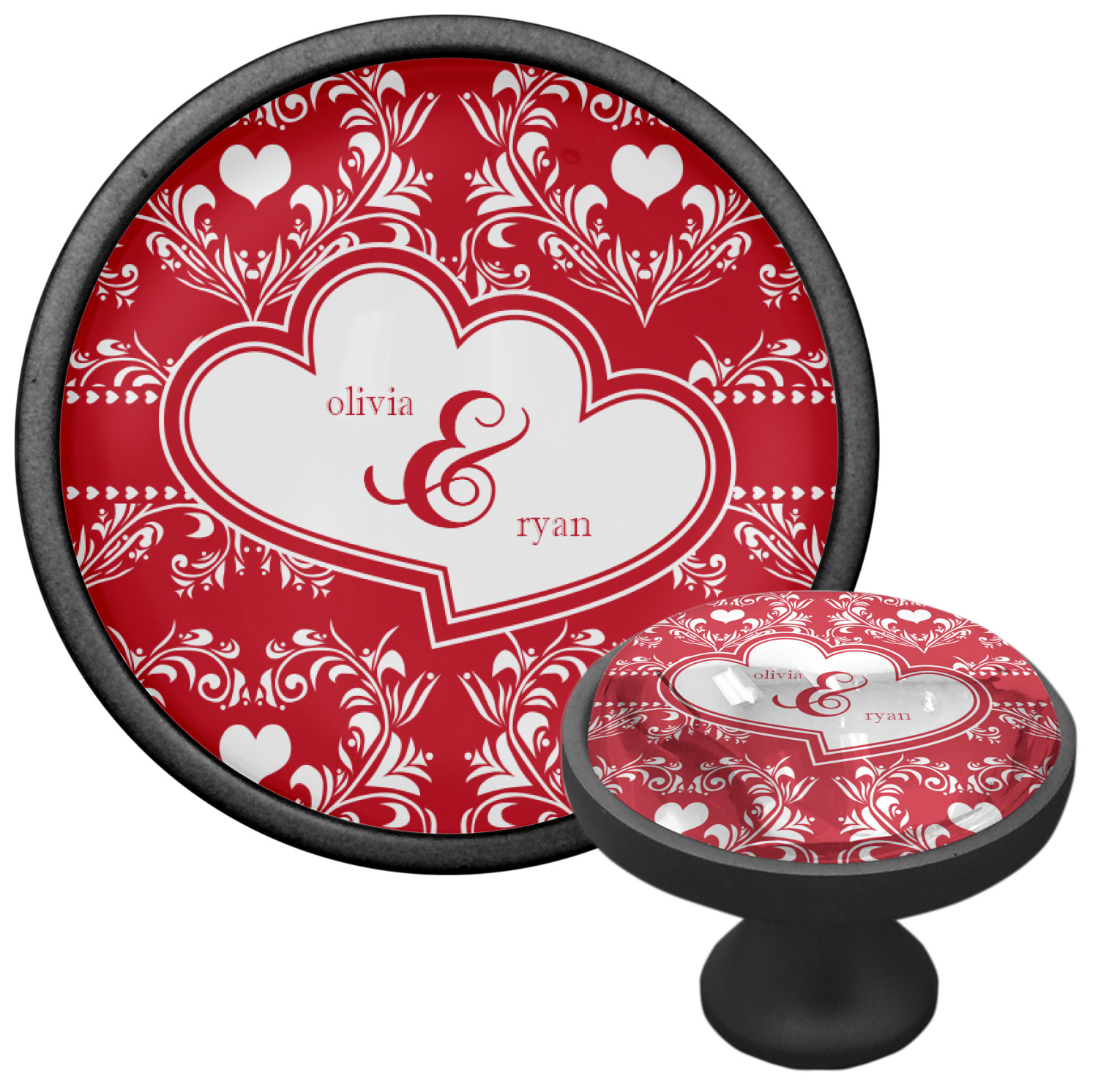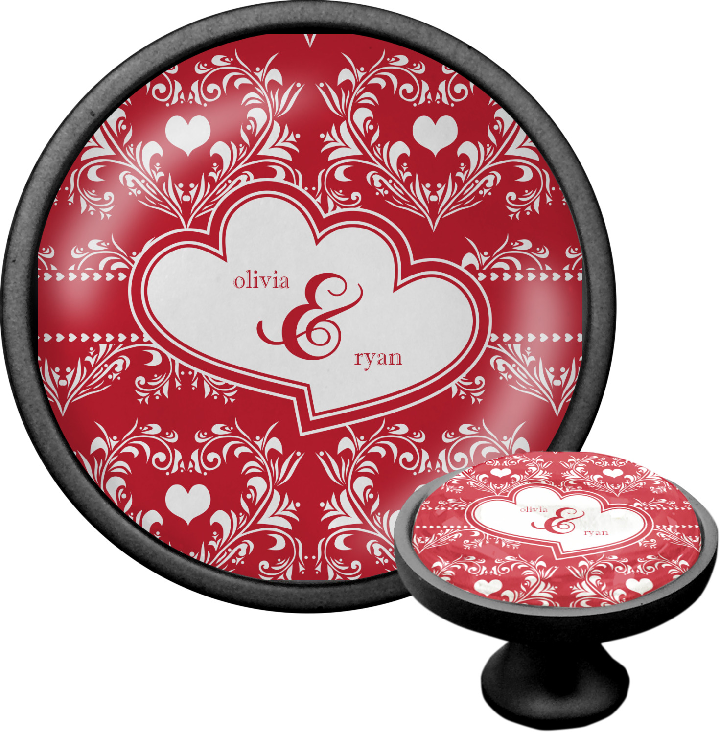 Two toned red damask hearts fill the solid red background with nothing but love. Tiny hearts link together to form a ribbon than anchor the two linking heart label. Personalize with two names to complete this love inspired damask design.