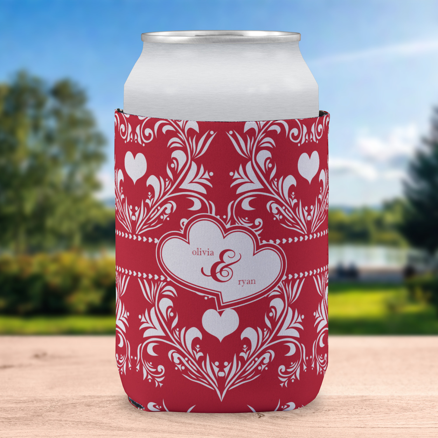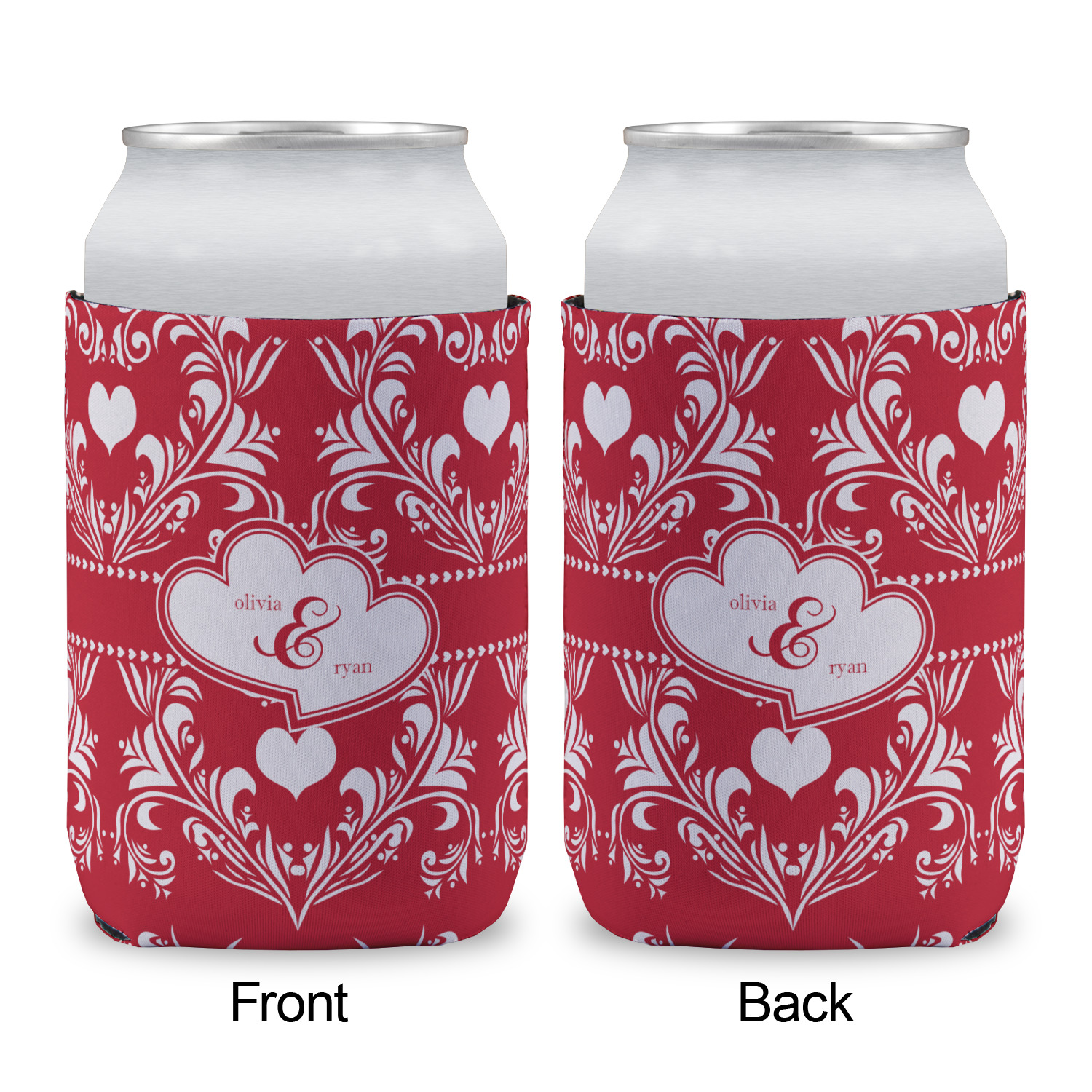 Two toned red damask hearts fill the solid red background with nothing but love. Tiny hearts link together to form a ribbon than anchor the two linking heart label. Personalize with two names to complete this love inspired damask design.