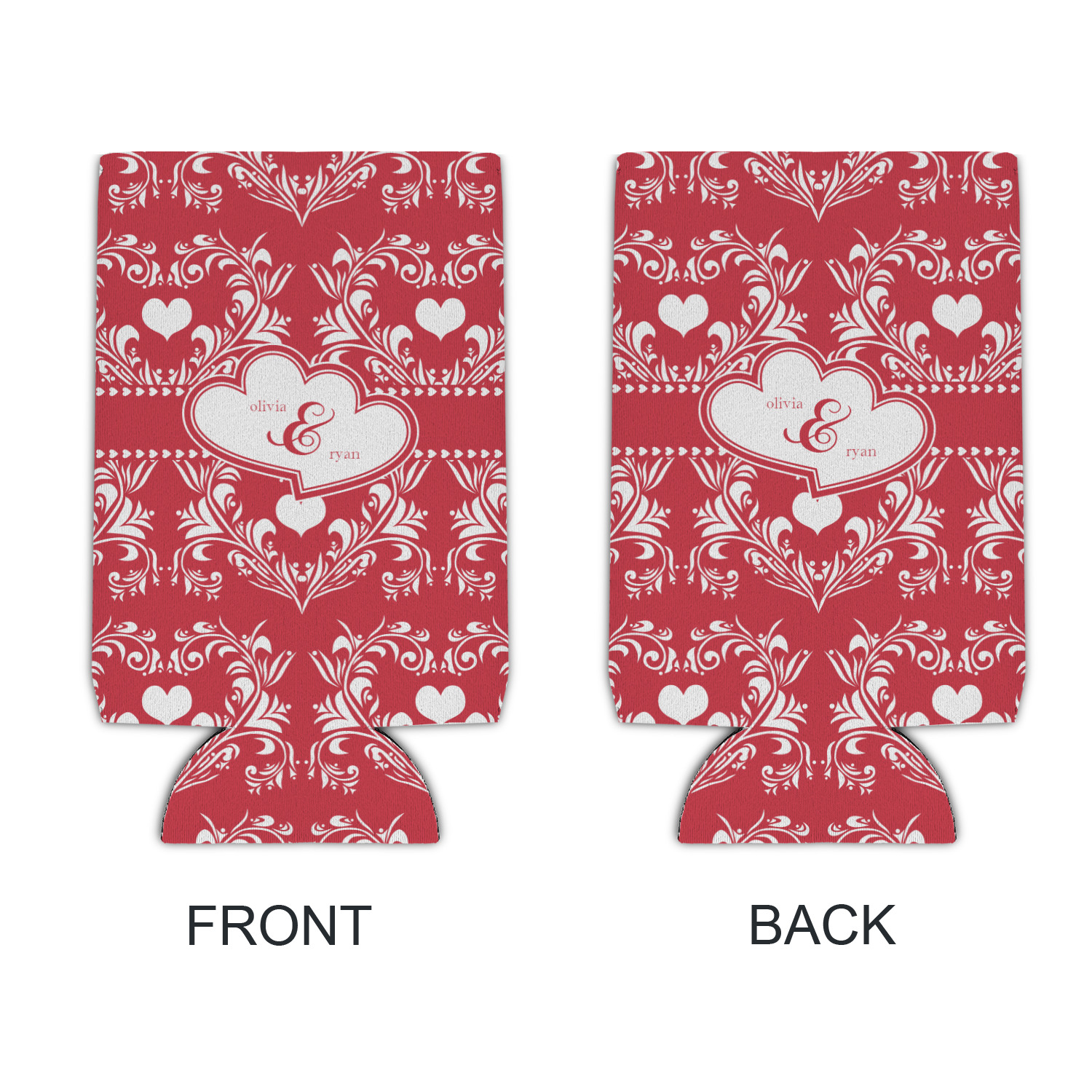 Two toned red damask hearts fill the solid red background with nothing but love. Tiny hearts link together to form a ribbon than anchor the two linking heart label. Personalize with two names to complete this love inspired damask design.