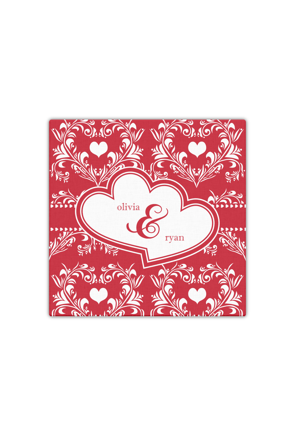 Two toned red damask hearts fill the solid red background with nothing but love. Tiny hearts link together to form a ribbon than anchor the two linking heart label. Personalize with two names to complete this love inspired damask design.