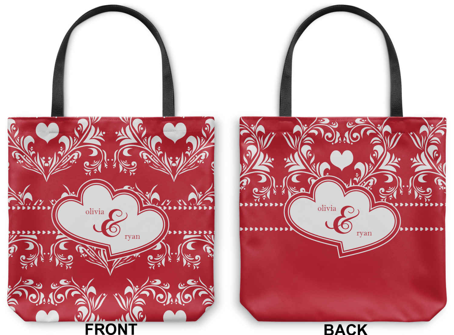 Two toned red damask hearts fill the solid red background with nothing but love. Tiny hearts link together to form a ribbon than anchor the two linking heart label. Personalize with two names to complete this love inspired damask design.