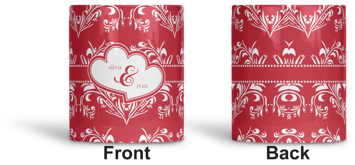 Two toned red damask hearts fill the solid red background with nothing but love. Tiny hearts link together to form a ribbon than anchor the two linking heart label. Personalize with two names to complete this love inspired damask design.