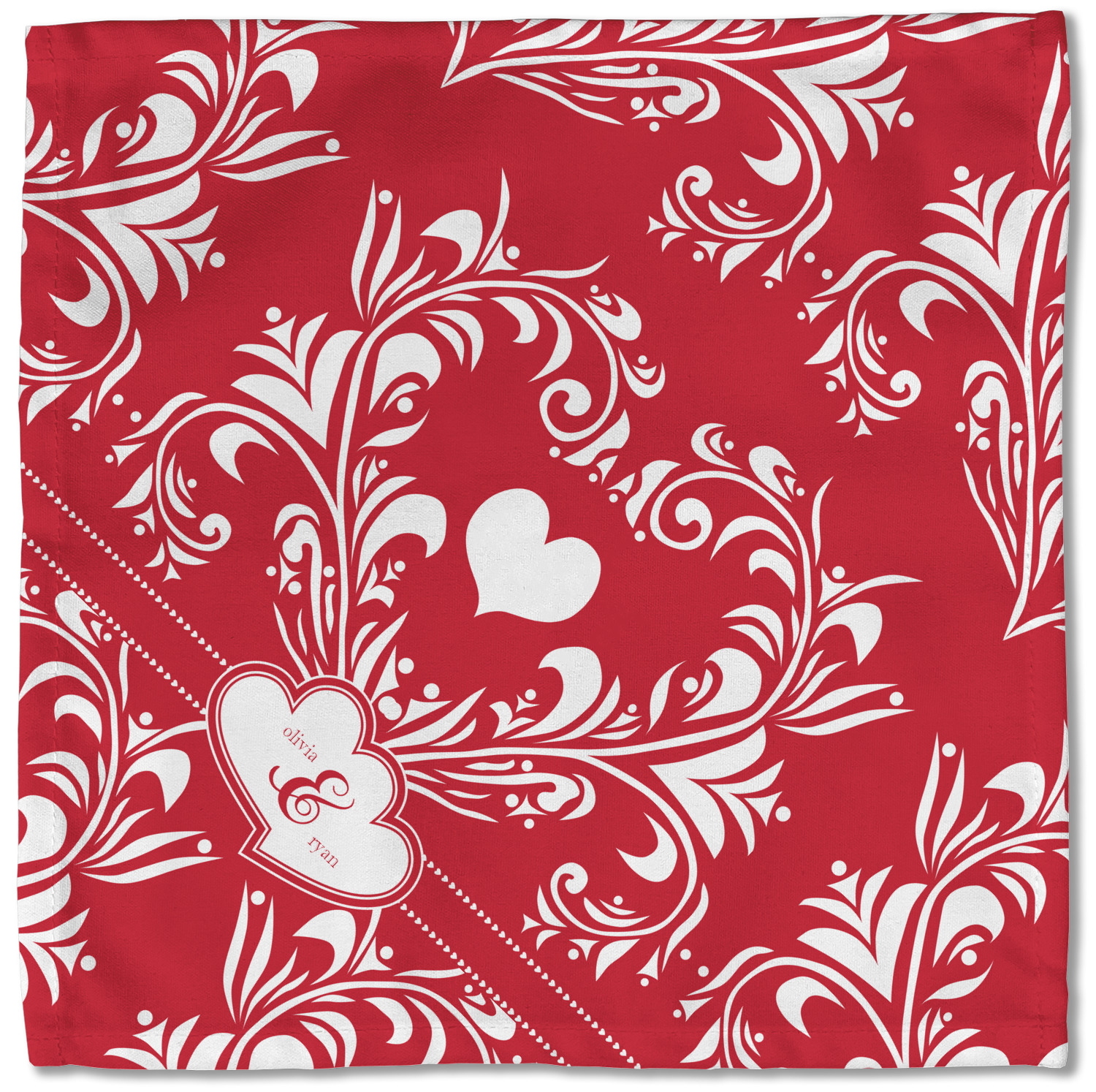 Two toned red damask hearts fill the solid red background with nothing but love. Tiny hearts link together to form a ribbon than anchor the two linking heart label. Personalize with two names to complete this love inspired damask design.
