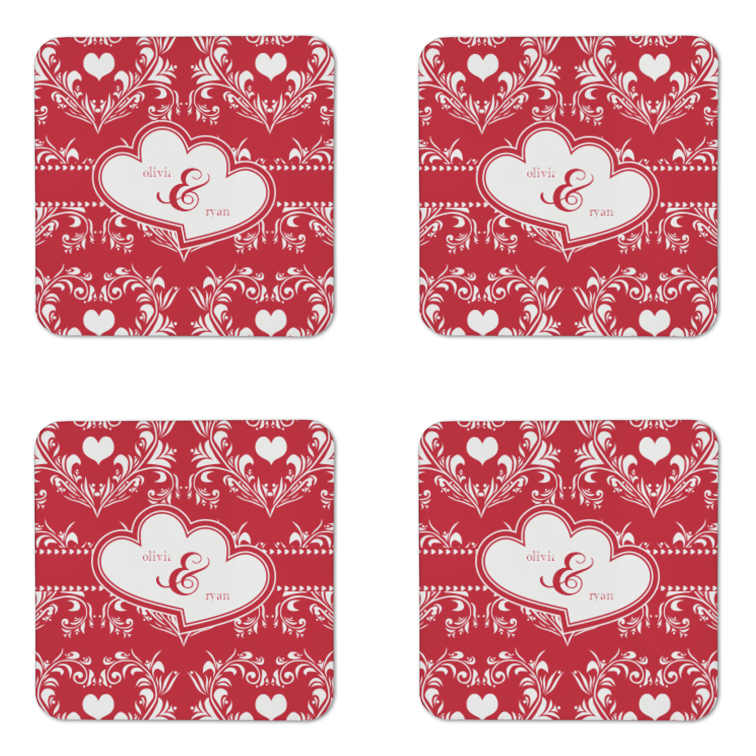 Two toned red damask hearts fill the solid red background with nothing but love. Tiny hearts link together to form a ribbon than anchor the two linking heart label. Personalize with two names to complete this love inspired damask design.