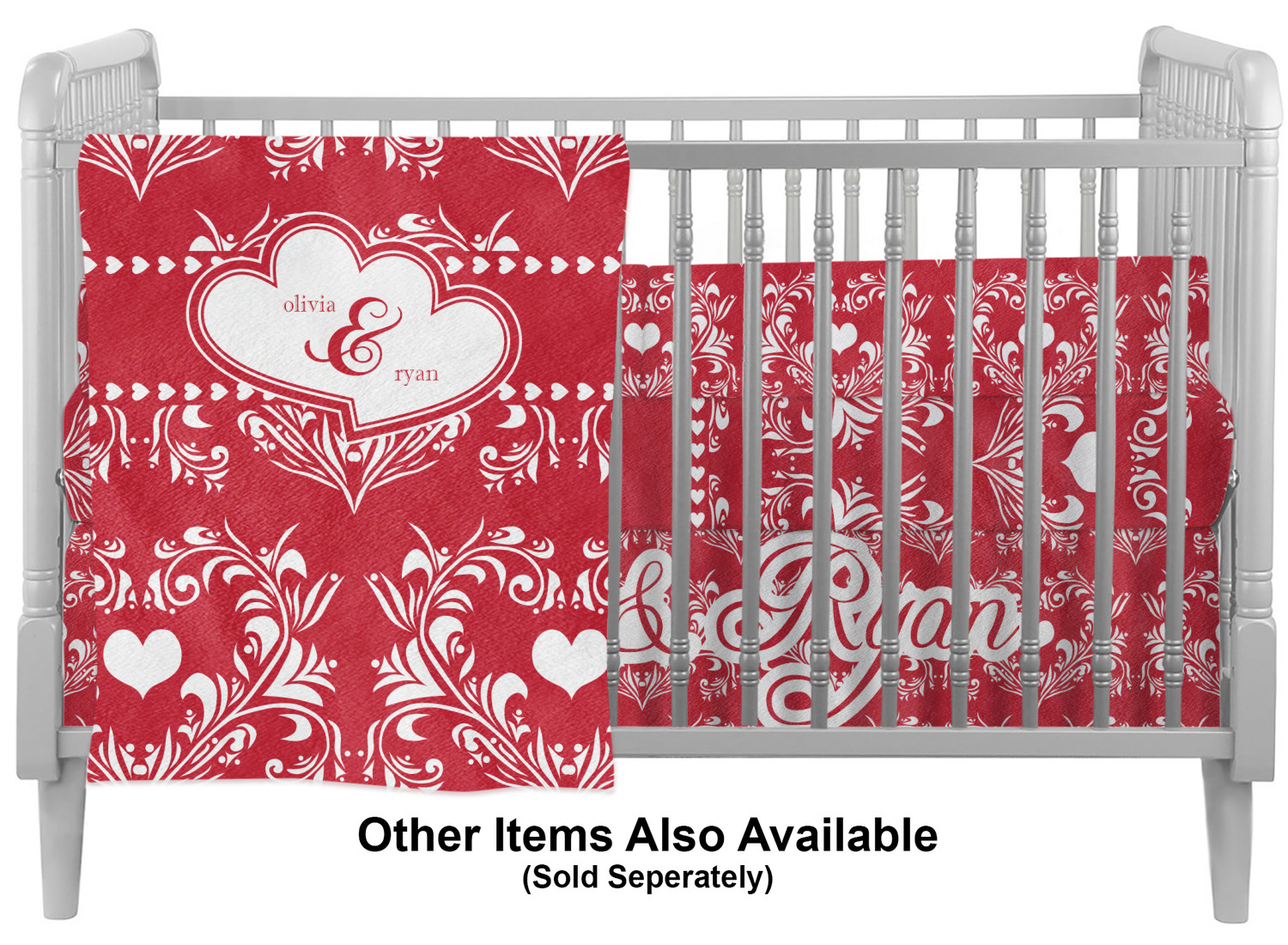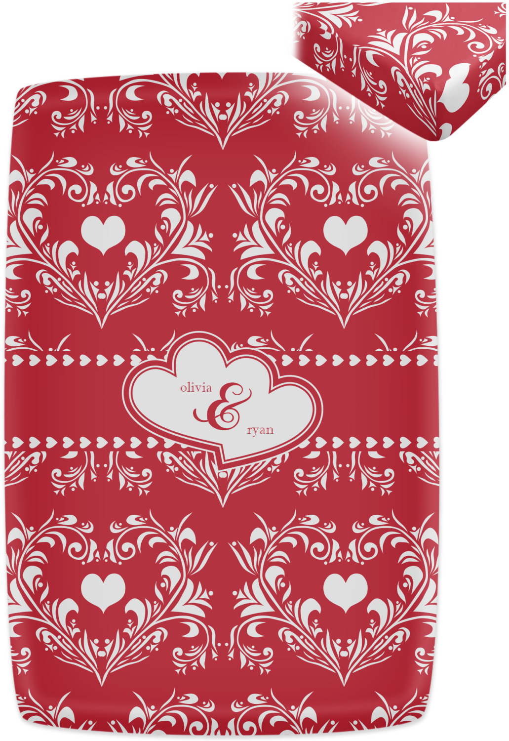 Two toned red damask hearts fill the solid red background with nothing but love. Tiny hearts link together to form a ribbon than anchor the two linking heart label. Personalize with two names to complete this love inspired damask design.