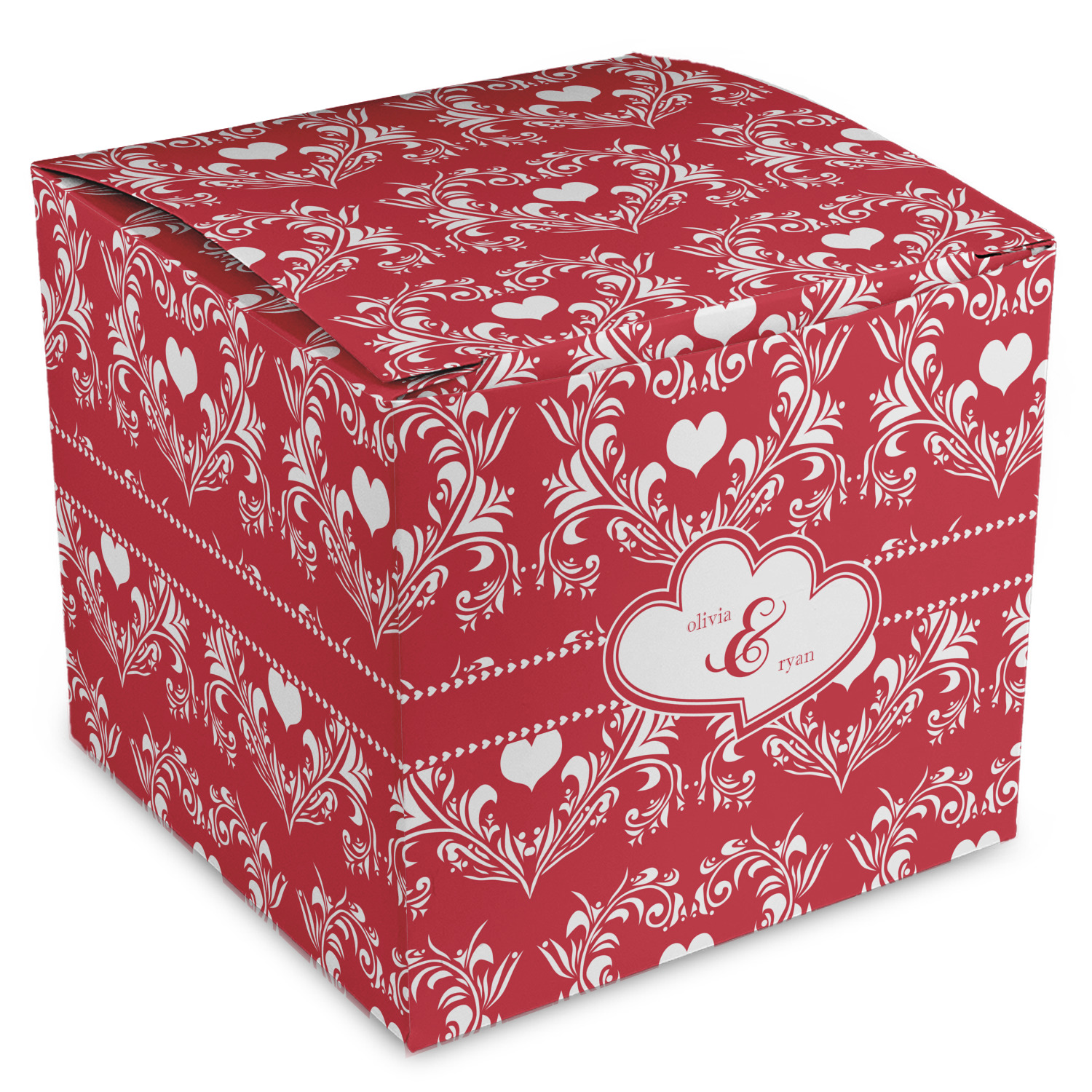 Two toned red damask hearts fill the solid red background with nothing but love. Tiny hearts link together to form a ribbon than anchor the two linking heart label. Personalize with two names to complete this love inspired damask design.