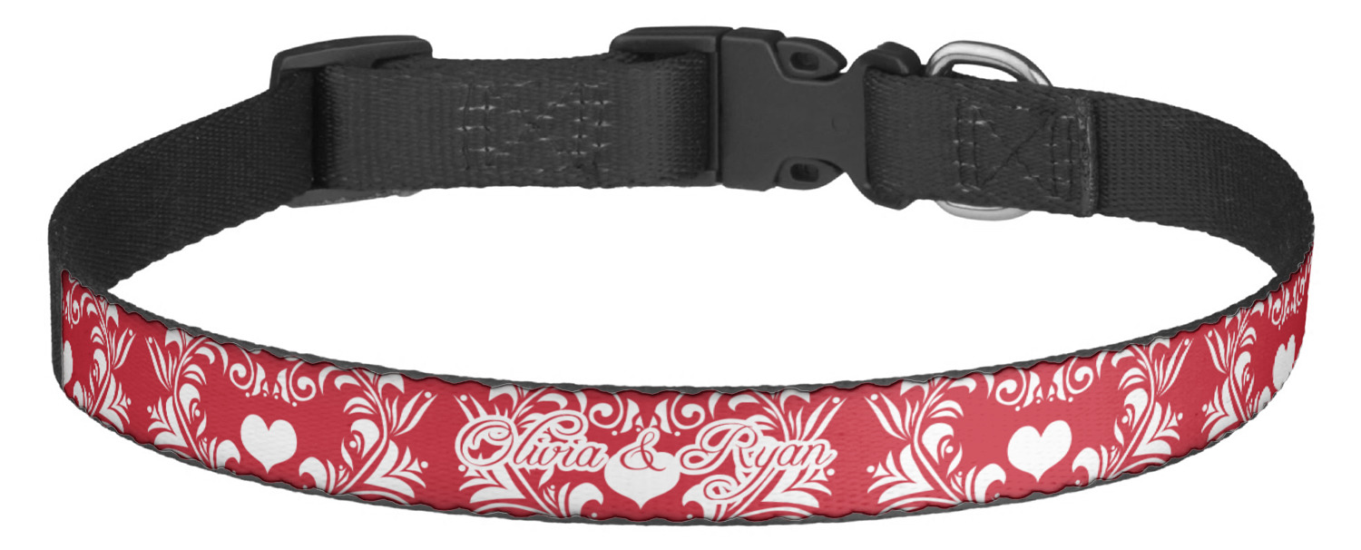 This sturdy collar, made from a durable nylon weave, will outlive your dog's episodes of excited tugging and pulling. Courtesy of its thick plastic buckle and adjuster, this collar is adjustable and accommodating of any dog. Structurally, the collar is a single piece of nylon weave that is sewn together, and features a solid metal loop where you can attach a leash or dog tag. We print and display your dog's name and pattern across the middle of the personalized dog collar.