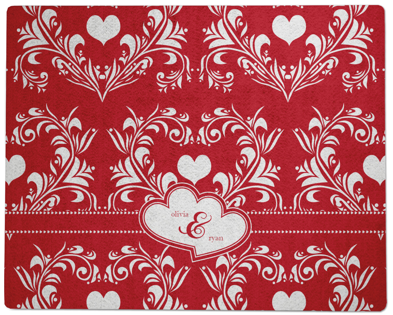 Two toned red damask hearts fill the solid red background with nothing but love. Tiny hearts link together to form a ribbon than anchor the two linking heart label. Personalize with two names to complete this love inspired damask design.