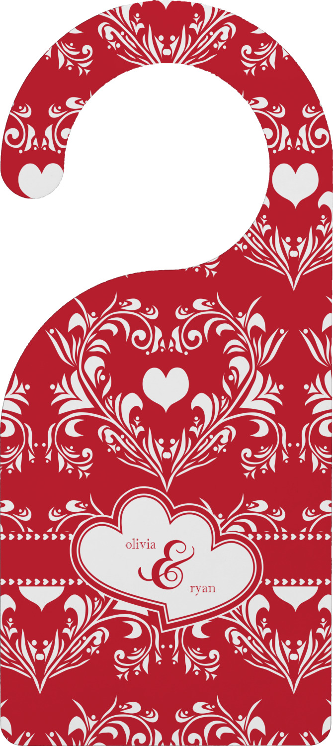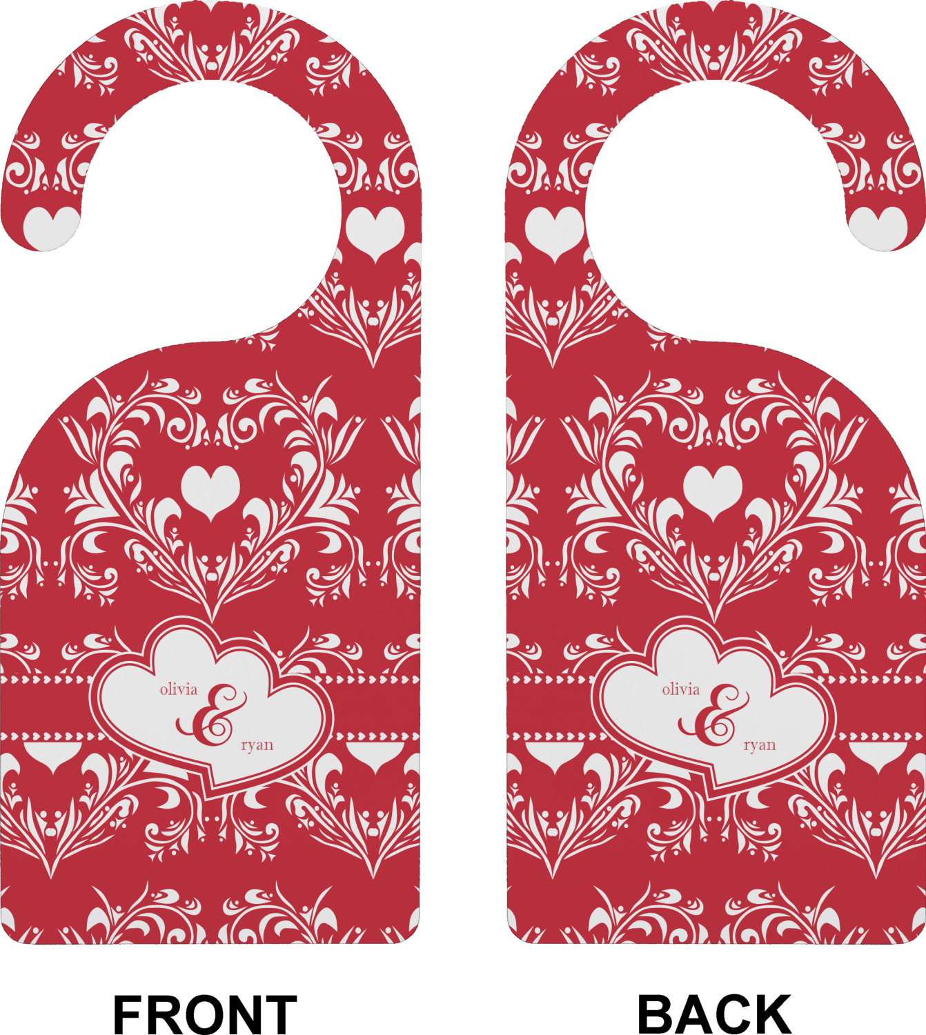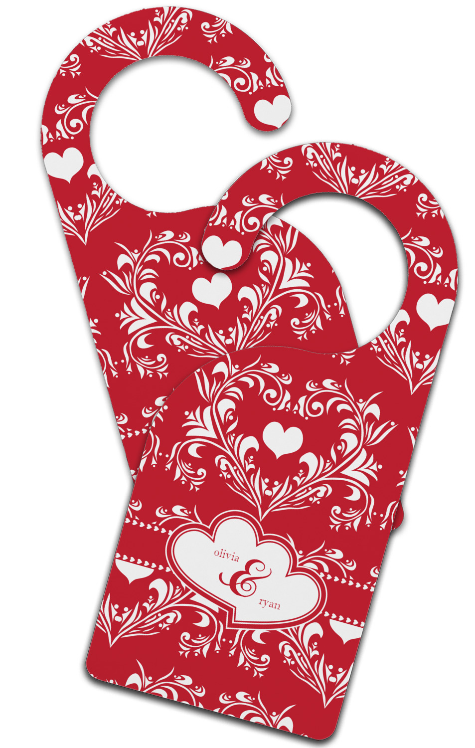 Two toned red damask hearts fill the solid red background with nothing but love. Tiny hearts link together to form a ribbon than anchor the two linking heart label. Personalize with two names to complete this love inspired damask design.