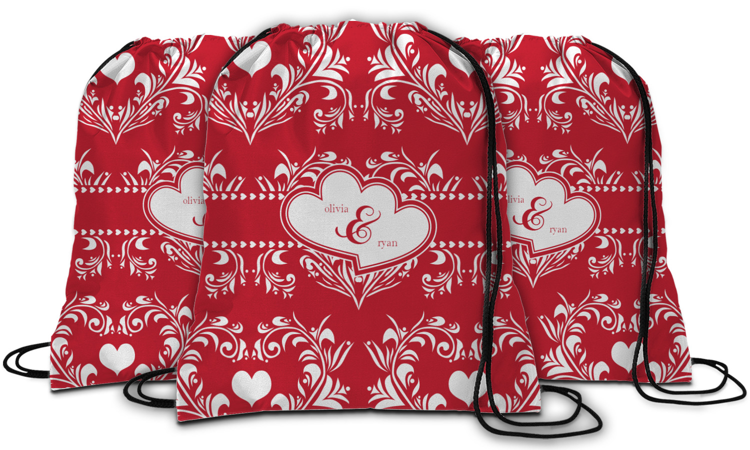 Two toned red damask hearts fill the solid red background with nothing but love. Tiny hearts link together to form a ribbon than anchor the two linking heart label. Personalize with two names to complete this love inspired damask design.