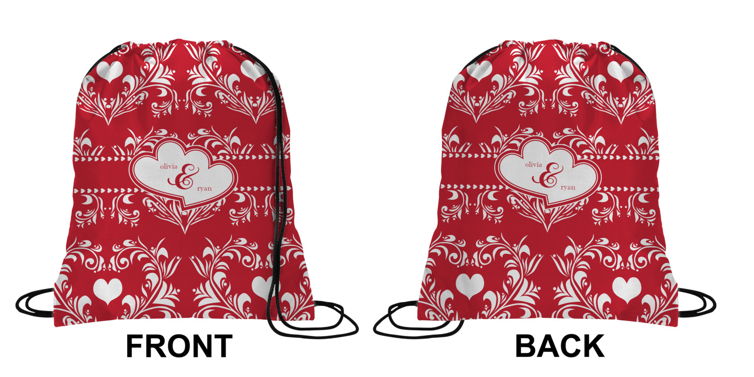 Your custom design will appear on the front and the back of the backpack. You can customize each side individually. The inside of the backpack is white and the drawstrings are black. The back pack is made of 100% polyester fabric.
