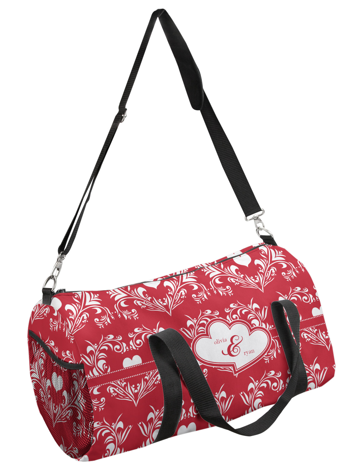 This duffle is a sturdy bag made of a canvas material. It comes in two sizes: Small (19"W x 9.5"H x 9.5"D) and Large (23"W x 12"H x 12"D). The bag is a cylindrical shape with a black adjustable strap and two handles. On one side is an elastic pouch to put a waterbottle or other small item. Your product will be sublimated with your design and is able to be designed on the front, back, and sides. Be sure to remember that the straps may cut into parts of your design if you upload your own artwork.