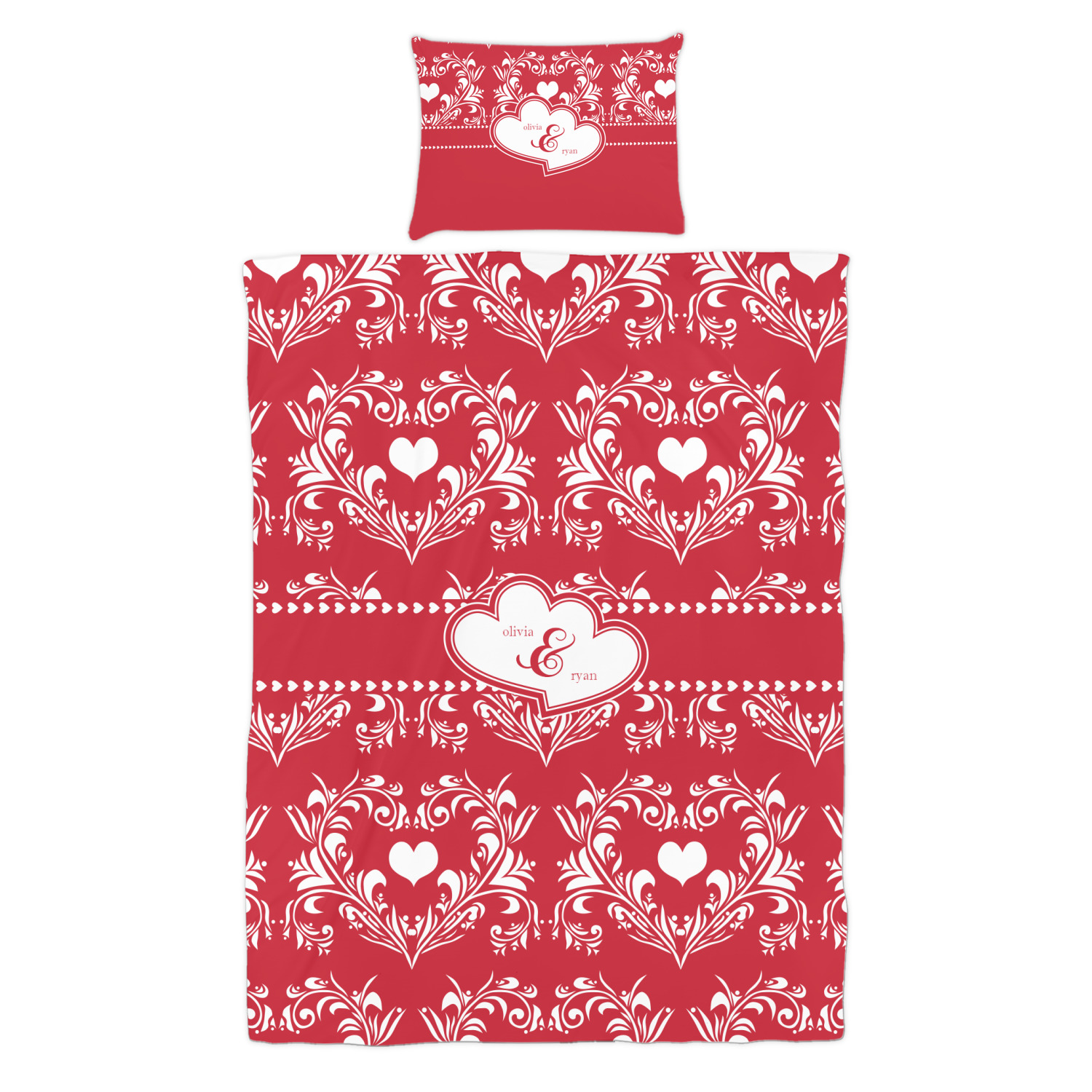 Two toned red damask hearts fill the solid red background with nothing but love. Tiny hearts link together to form a ribbon than anchor the two linking heart label. Personalize with two names to complete this love inspired damask design.