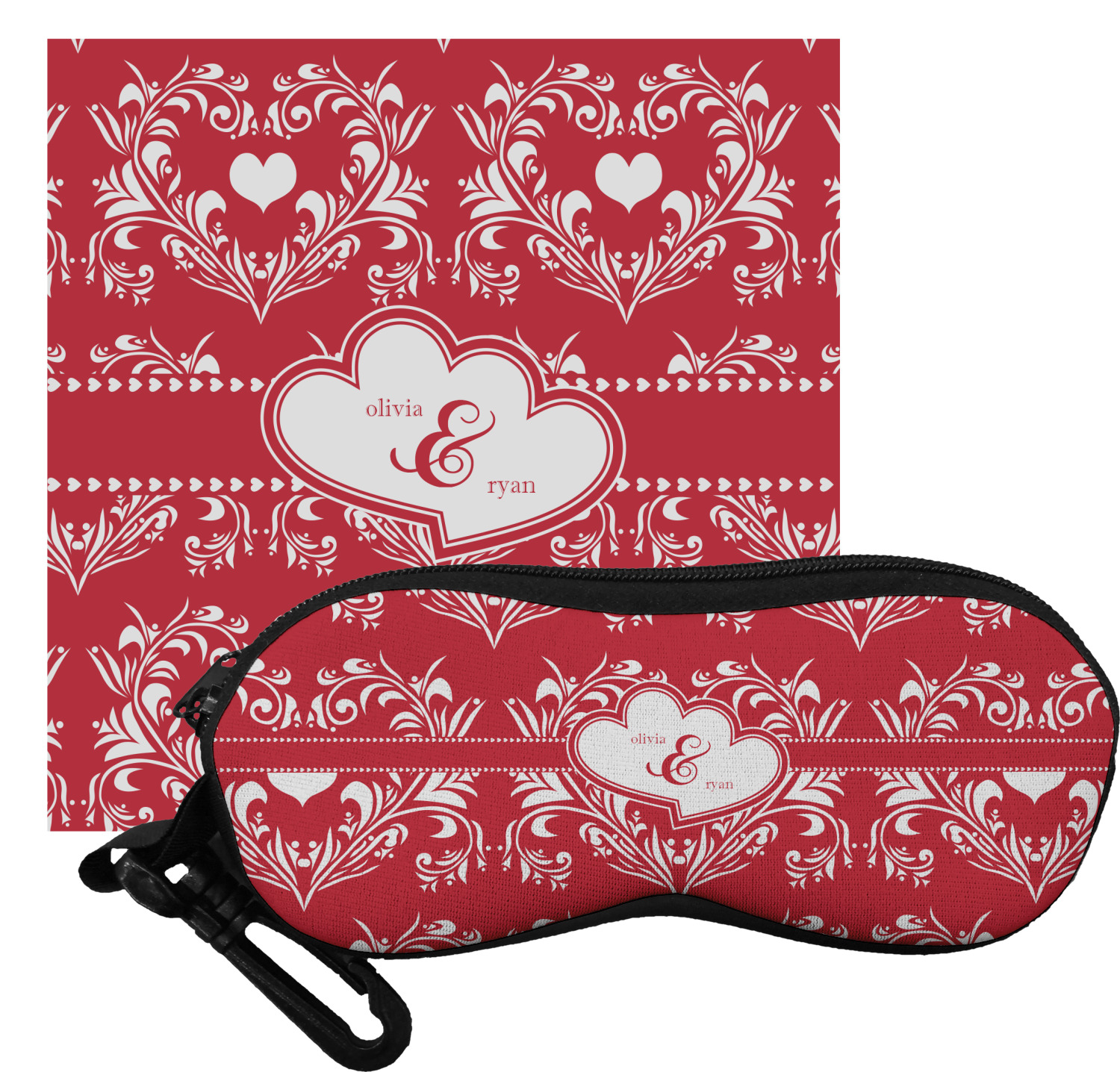 Two toned red damask hearts fill the solid red background with nothing but love. Tiny hearts link together to form a ribbon than anchor the two linking heart label. Personalize with two names to complete this love inspired damask design.