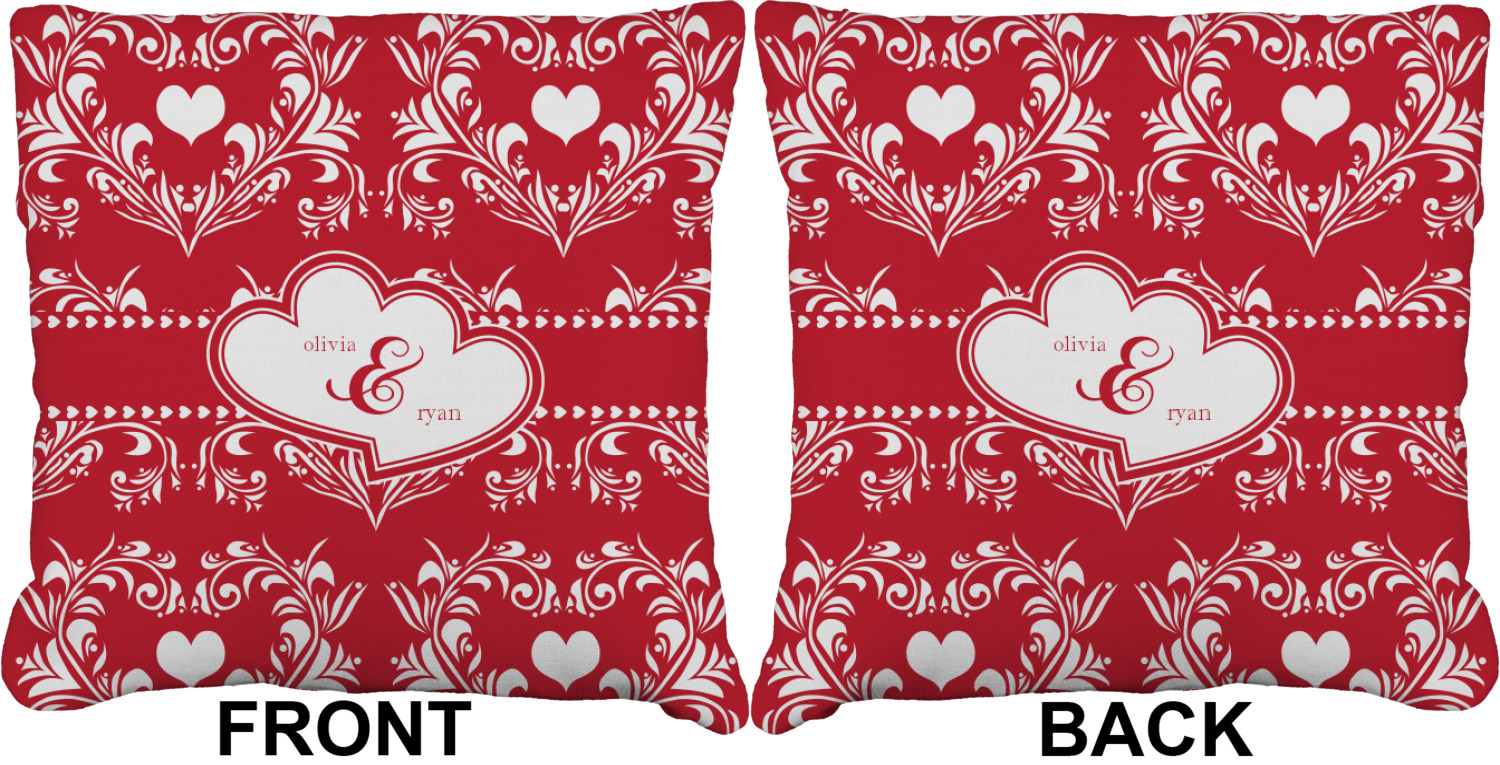 Two toned red damask hearts fill the solid red background with nothing but love. Tiny hearts link together to form a ribbon than anchor the two linking heart label. Personalize with two names to complete this love inspired damask design.