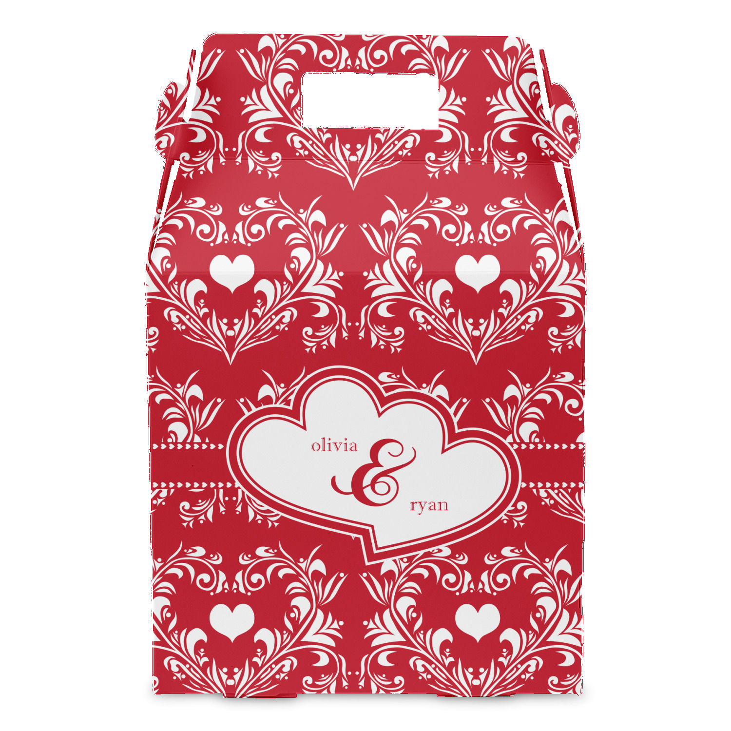 Two toned red damask hearts fill the solid red background with nothing but love. Tiny hearts link together to form a ribbon than anchor the two linking heart label. Personalize with two names to complete this love inspired damask design.