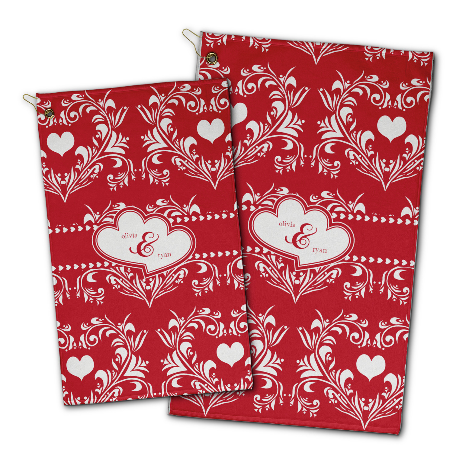 Two toned red damask hearts fill the solid red background with nothing but love. Tiny hearts link together to form a ribbon than anchor the two linking heart label. Personalize with two names to complete this love inspired damask design.
