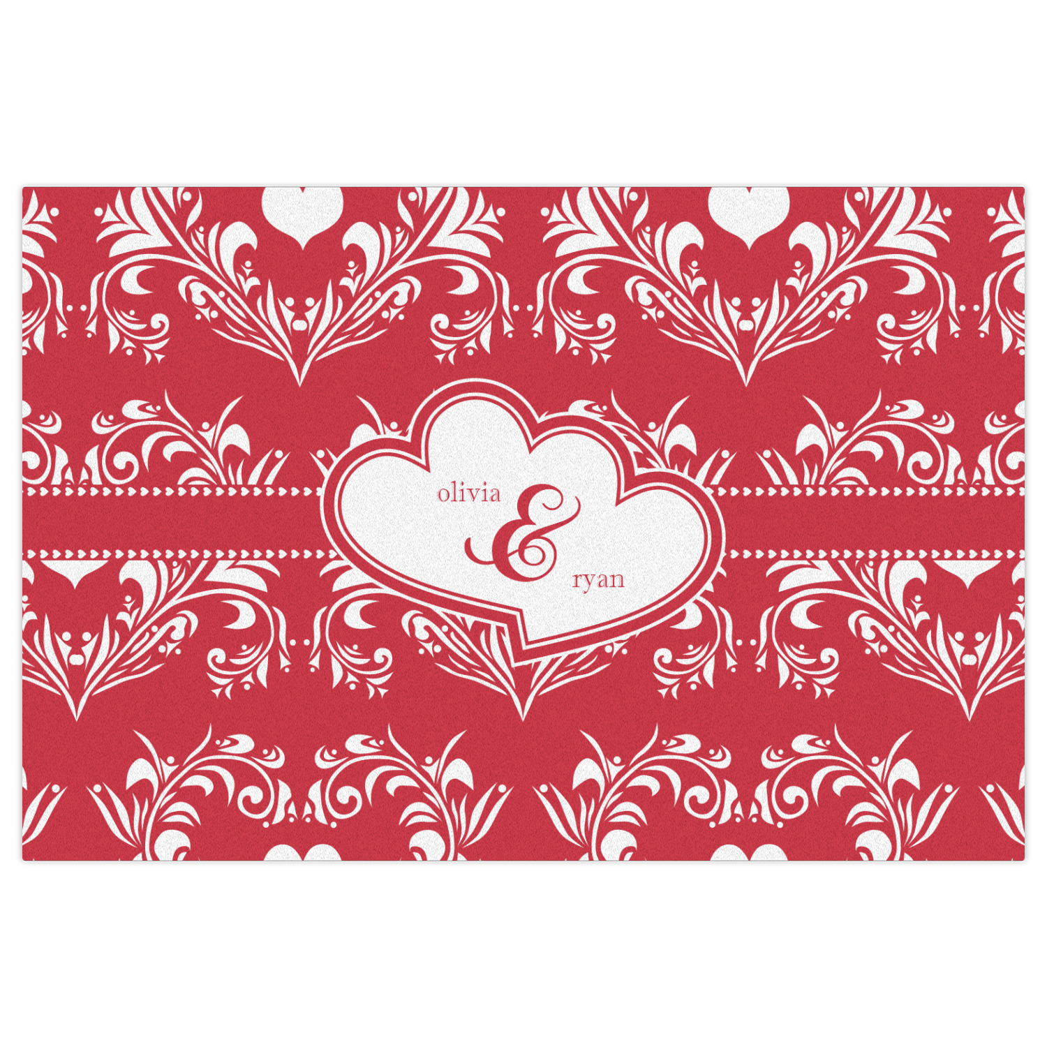 Two toned red damask hearts fill the solid red background with nothing but love. Tiny hearts link together to form a ribbon than anchor the two linking heart label. Personalize with two names to complete this love inspired damask design.