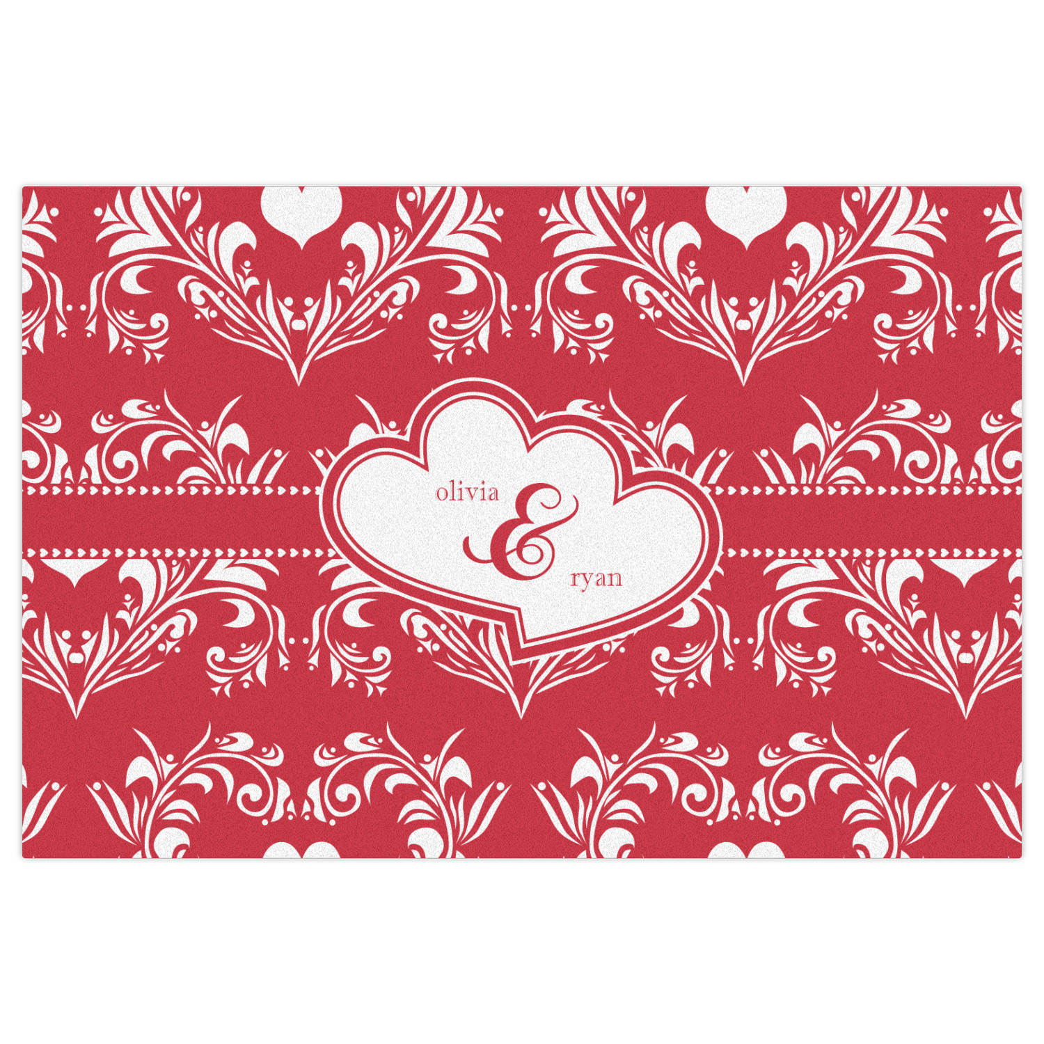 Two toned red damask hearts fill the solid red background with nothing but love. Tiny hearts link together to form a ribbon than anchor the two linking heart label. Personalize with two names to complete this love inspired damask design.