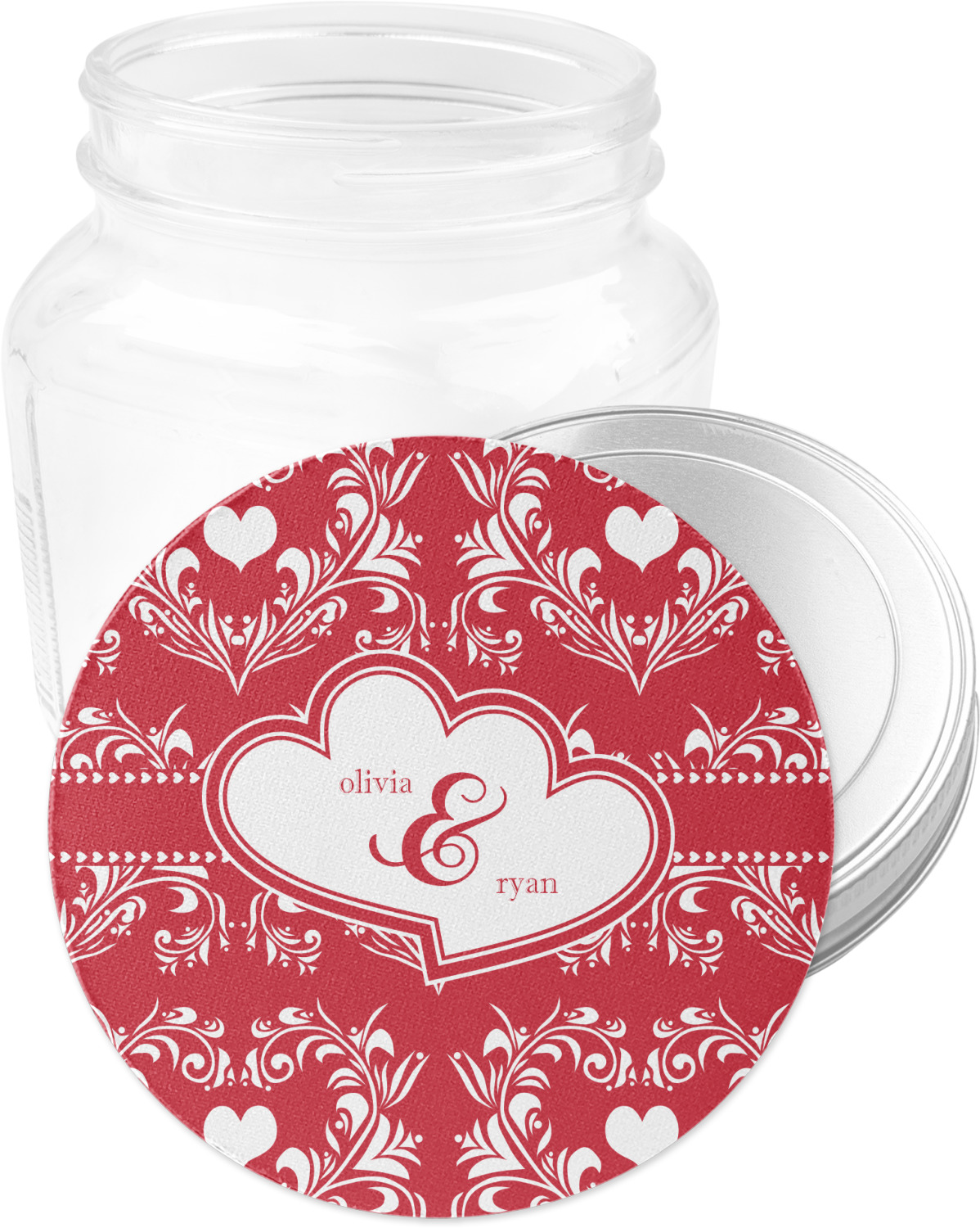 Two toned red damask hearts fill the solid red background with nothing but love. Tiny hearts link together to form a ribbon than anchor the two linking heart label. Personalize with two names to complete this love inspired damask design.