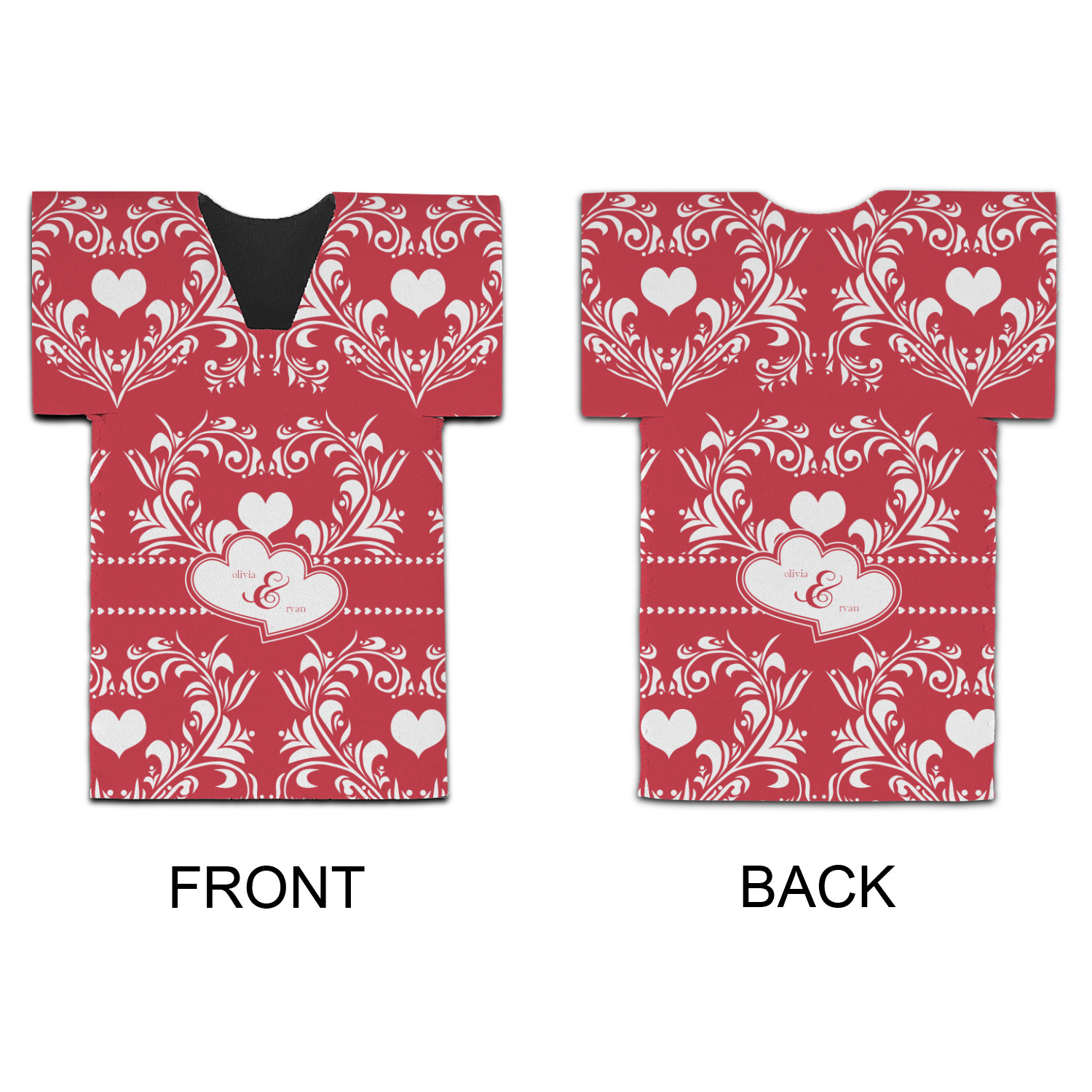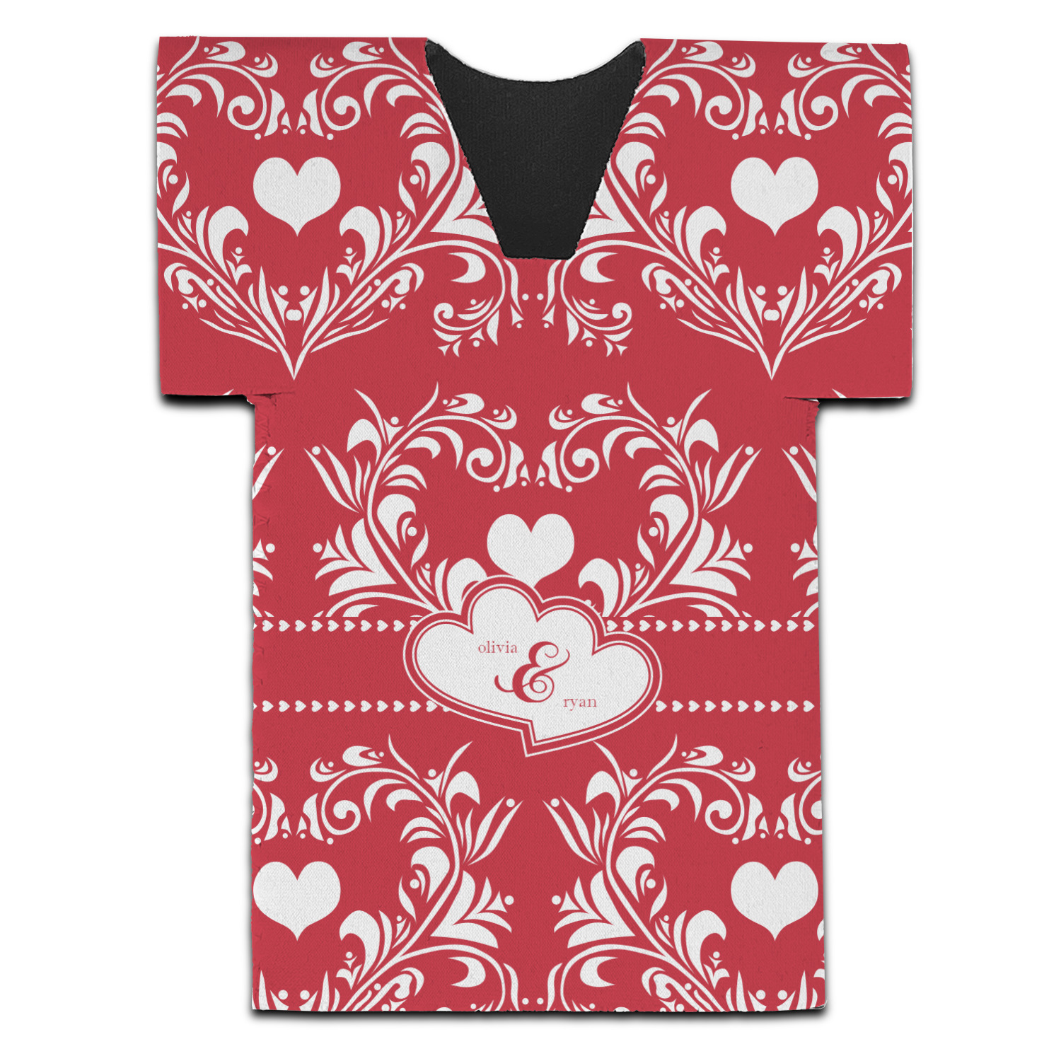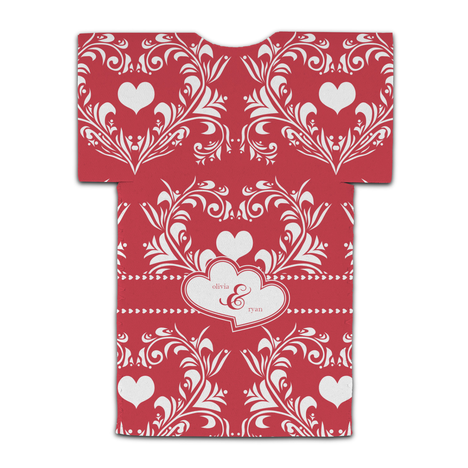 Two toned red damask hearts fill the solid red background with nothing but love. Tiny hearts link together to form a ribbon than anchor the two linking heart label. Personalize with two names to complete this love inspired damask design.