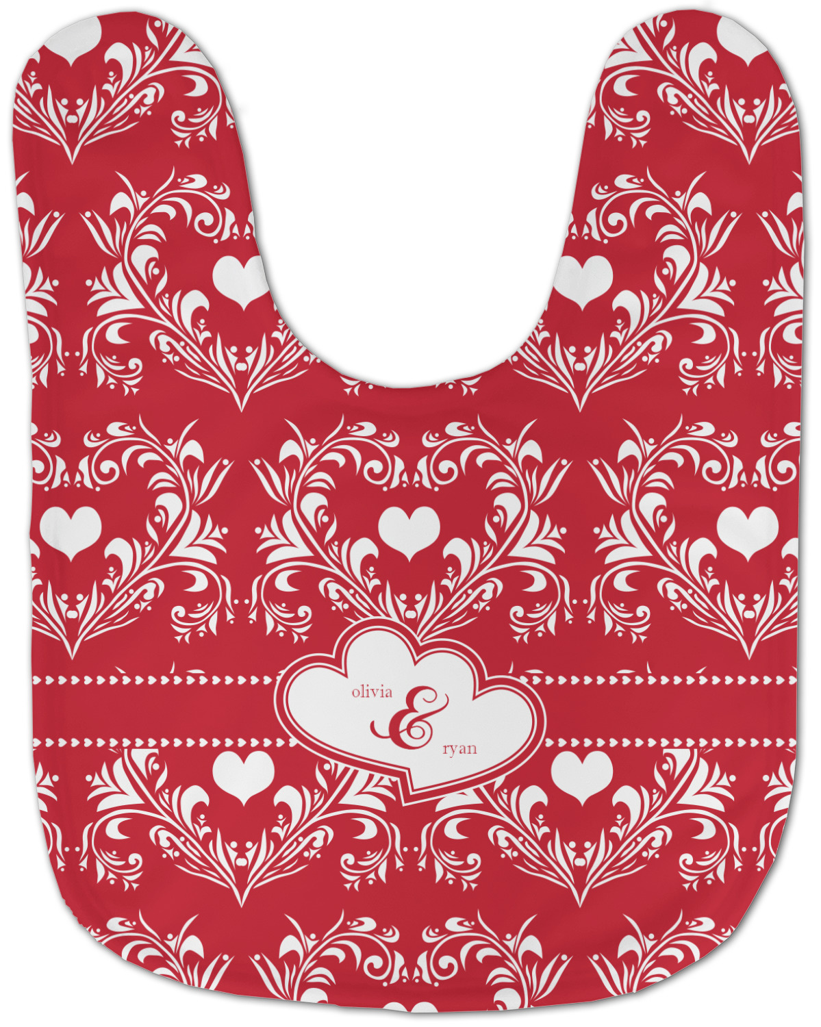 Two toned red damask hearts fill the solid red background with nothing but love. Tiny hearts link together to form a ribbon than anchor the two linking heart label. Personalize with two names to complete this love inspired damask design.