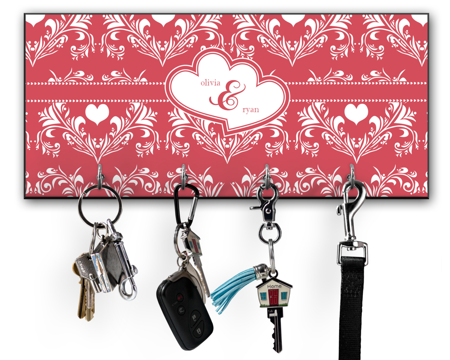 This 11" x 5" key hanger is made of sturdy wood and has four metal hooks lining the bottom. This is the perfect size for a family with several drivers. Not only can you hang keys on it though, but pet leashes and other small items. The board is black on the sides and back and is printed with the design of your choice on the front.