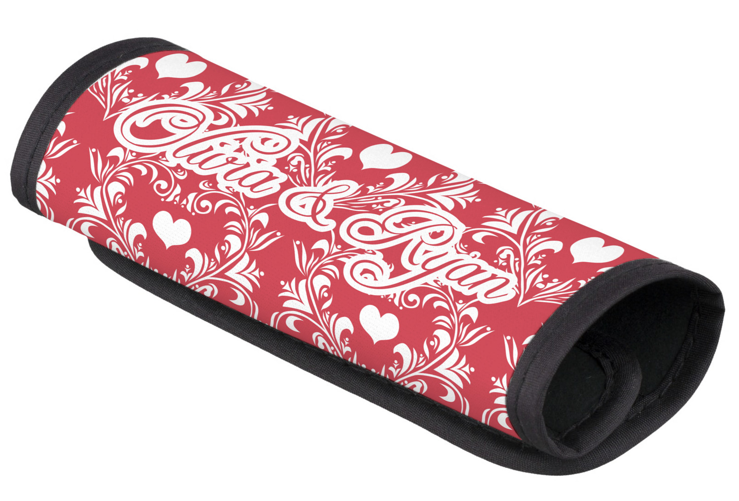 The luggage handle covers are made of neoprene with black trim and have Velcro closure to snugly fit around the handle. Your design is printed on the neoprene. The covers measure approx 5"x6".