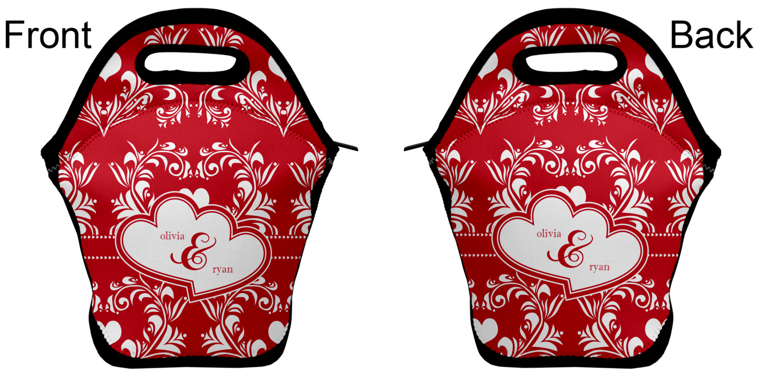 Our personalized lunch bags are made from a strong neoprene, and secure with a zipper closure that lines the top of the bag.The edges of the neoprene are sewn together with a heavy duty stitch, adding to the durability of the bag. The is accompanied by a reinforced handle at its top, for the easy transport of your lunch. We display your personalization across both the front and back of this neoprene lunch bag, while the remaining sides are a sleek black in color. Each bag measures at 13.5 inches tall, and 11.5 inches wide.